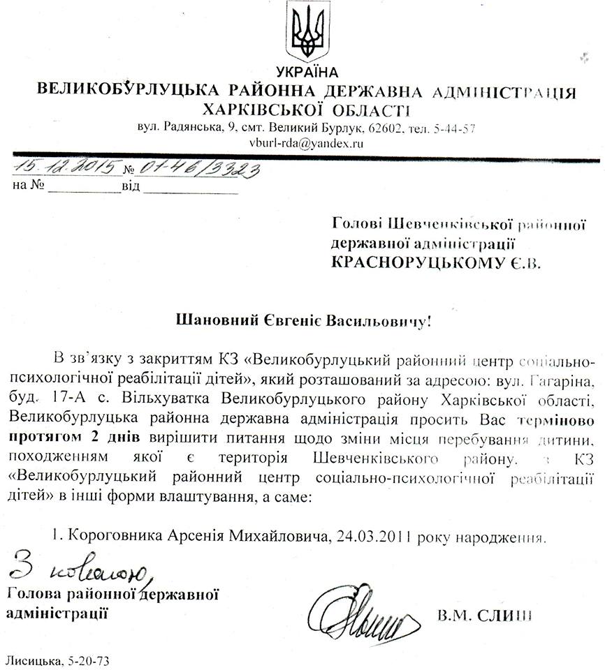 Тим часом голова райдержадміністрації Великобурлуцького району Слиш В.М. (https://www.facebook.com/viktor.slysh?fref=ts) почав розсилати по районам прохання забрати дітей із Центру, мотивуючи це «закриттям Центру» (копії документів додано).