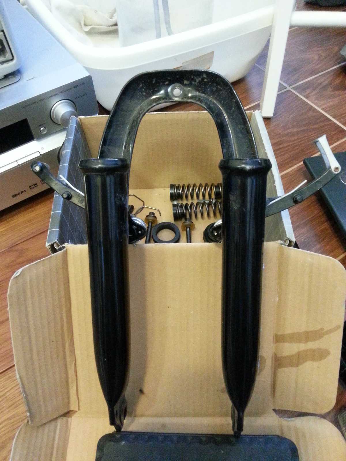 Купил малому БУ Giant велосипед с 20" колесами и пружинной вилкой. Вилка работала нормально, но было много грязи. Пока зима и руки чешутся решил немного подшаманить велосипед. Разобрал вилку, все как в обычных простых пружинных недо-вилках. Но все же решил уточнить на всякий случай: