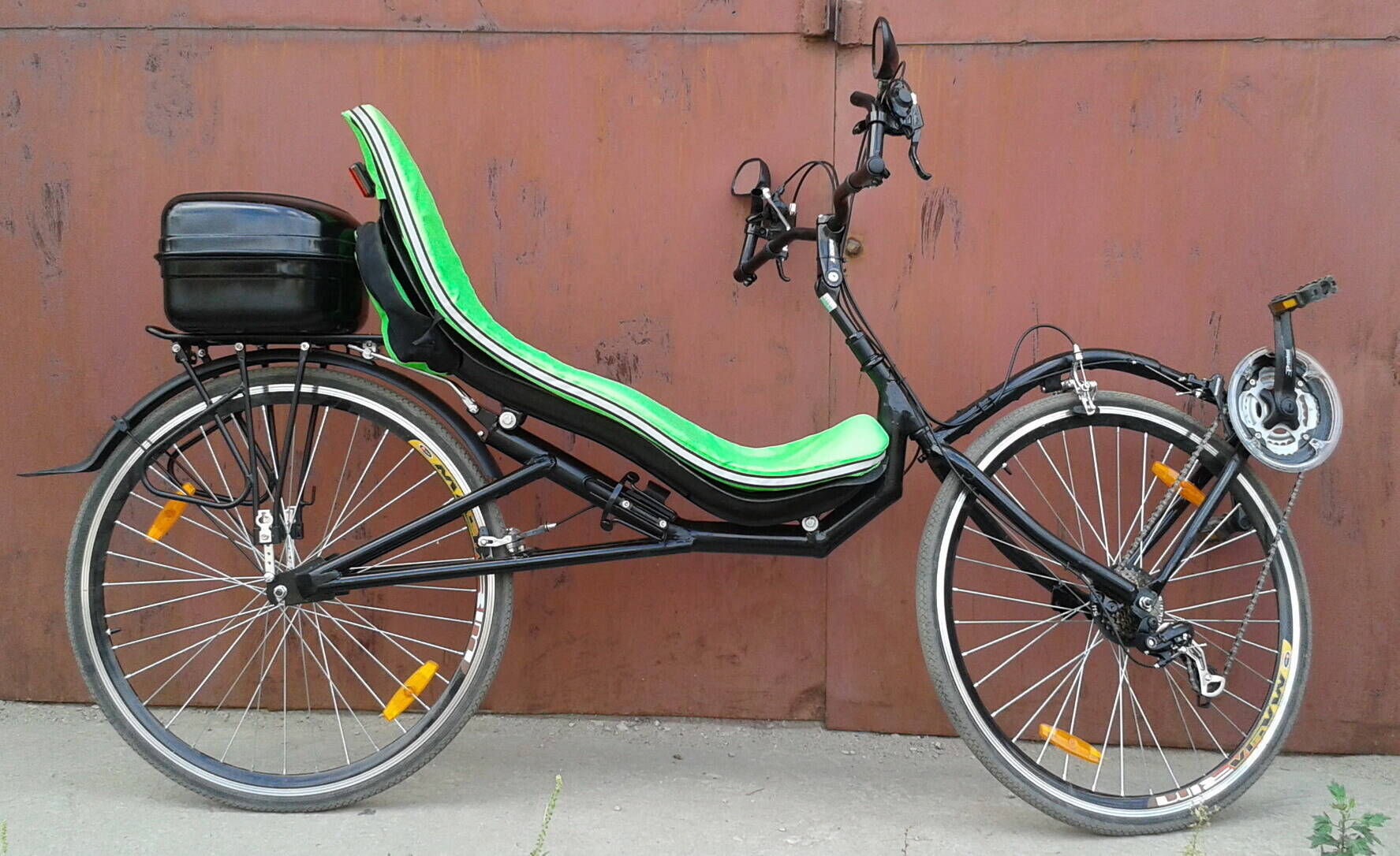 Для такой конструкции есть особенности в управлении. (тяжело держать баланс). Я только научился уверенно стартовать и ездить на малой скорости (скорость пешехода). В общем так = по лесопарку кататься медленно получается, прикольно было ехать вдоль жд. В горку, с места - проблема из за особенности рулевой. Давишь на педаль - руль уходит в сторону. На шоссе да и на скорости - отлично.