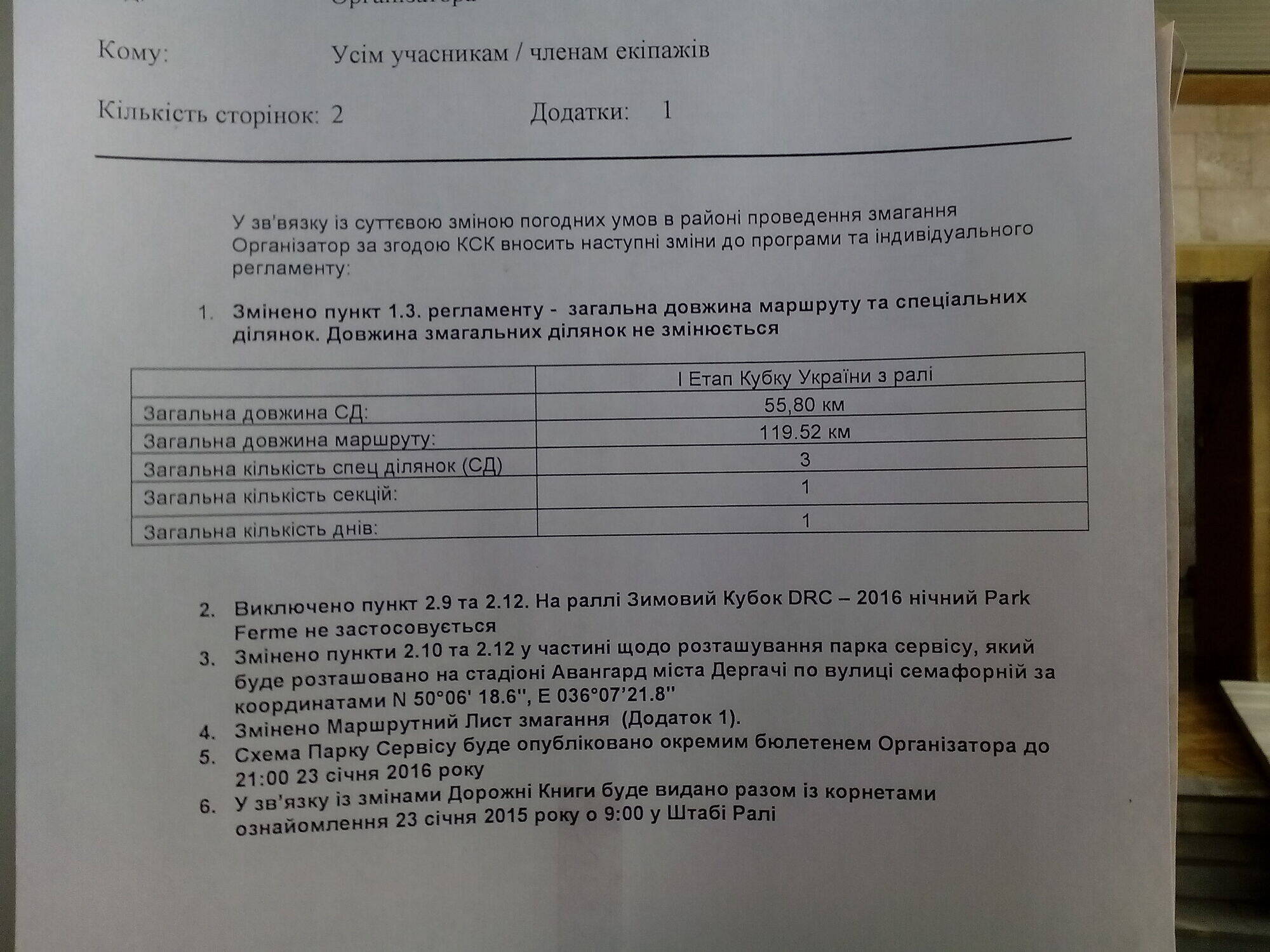 24.01.2016. Старт первого серийного авто в 08:15 на площади свободы г. Харьков в сторону г. Дергачи в сервис парк. Автомобили которые едут в Кубке с 07:00 выезжают с закрытого парка. Мотель Дружба в парк сервис. И до 09:00 Кубковые авто будут в парке сервиса. И до 09:00 приедут все серийные автомобили которые едут в трофее. Затем в 09:15 старт первого боевого авто. После кубкового канала, начнут ехать любители.