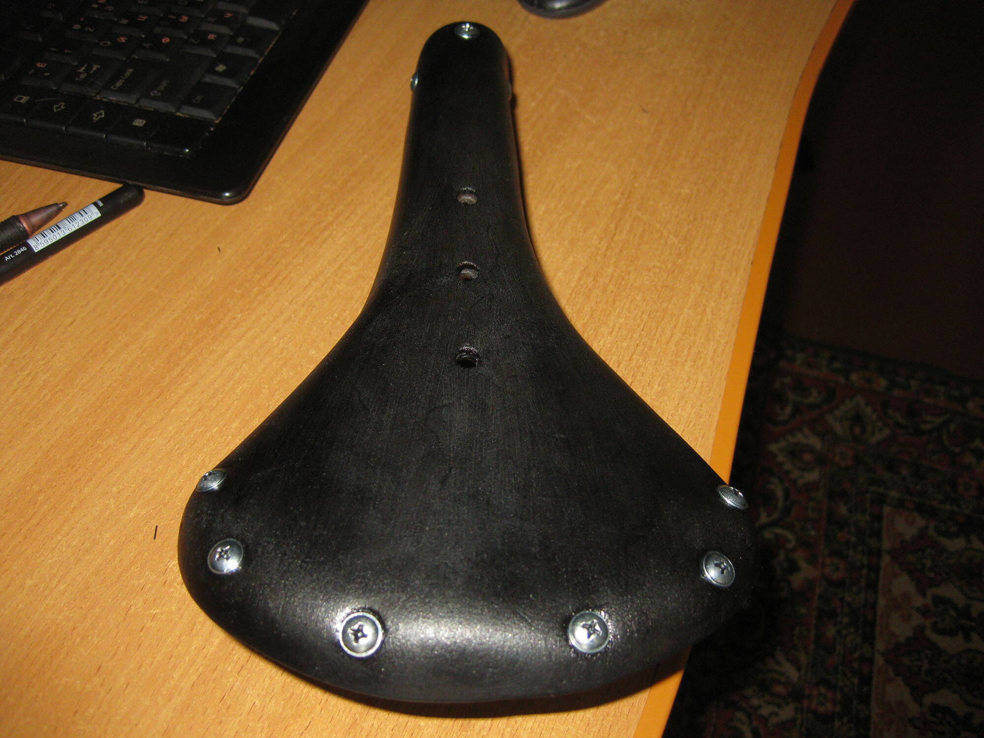П.С. Чего боюсь. Два раза желатинил, седло стало звенеть как фанера, воск не сильно помог, боюсь, чтоб кожа не утратила гибкость и не порвалась от нагрузки жопы (80 кг), не приклеил внутренний лист кожи, т.к. когда желатинил он как-бы сам приклеился к чепраку. Думаю, не потеряется: он же тоже на винтах сидит. Надо будет - откручу и приклею. Ну и третье, надо чтоб седло не марало задницу, особенно после воска. Покатаюсь сначала в старых вратарских черных штанах, кстати, удобная вещь за неимением велоштанов- зауженные штанины и резинки на ступни. Плюс, мягкие вставки на коленях и боках- один раз помогло, когда положил вел на бок на гравии.