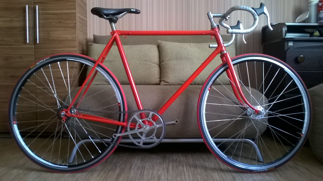 Всем привет, давно сюда не писал, потому что давно не занимался великом, этим. В прошлом году разобрал, отдал на перекраску, где мне его "успешно" перекрасили... не снимая предыдущий слой, о чём сообщили мне уже по факту разводя руками, мол установка не работала ... Так рама и висела год в кладовке, добрался собрал. Но только в этот раз уже без скоростей. Синглспид на родной системе и трещётке, приводная звезда 51, ведомая 16. Тормозные ручки нашёл покрасивше, с обрезиненными слониками, алхона. Удалось найти новый вал каретки.