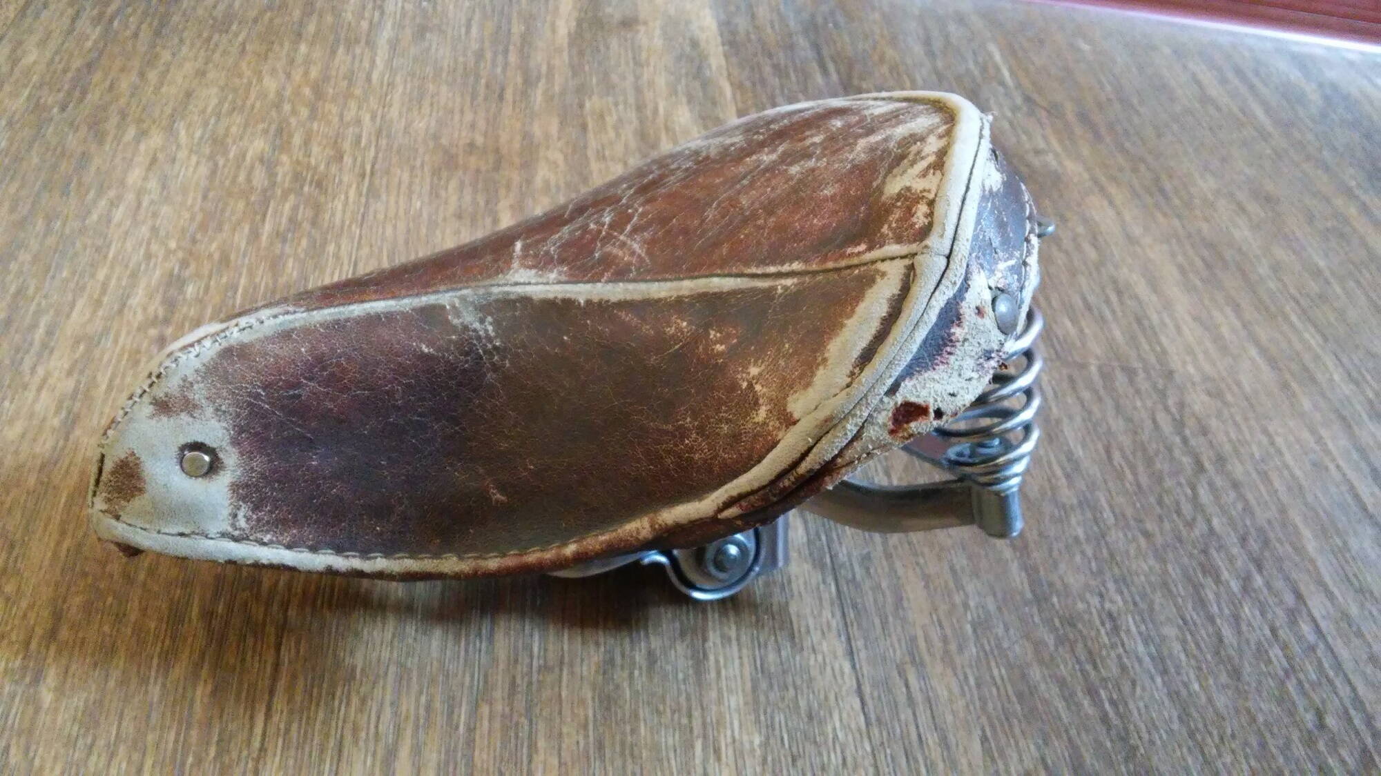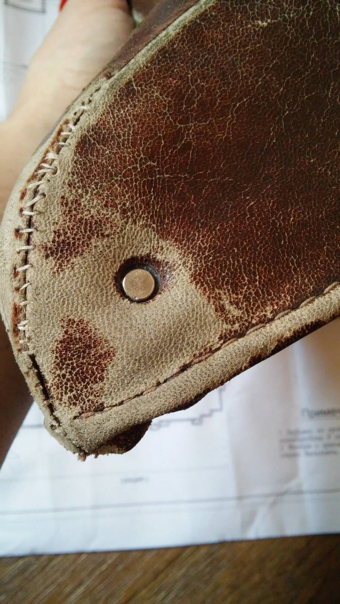 Из кожи (кусок на фото) будут сделаны 2 ремешка на оригинальных пряжках (пряжки ищу пока). Временно бардак закреплен на седле белыми ПЭ хомутами.