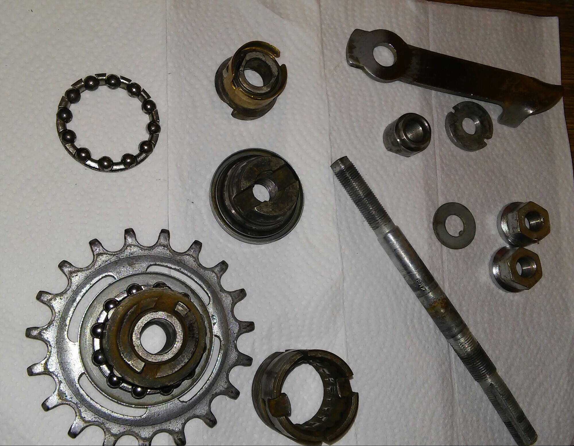 За выходные удалось немного - очистить детали задней втулки. Радость - подшипники живы, все с минимальным износом. На днях соберу втулку. Все детали (кроме подшипников) - все с клеймами ХВЗ