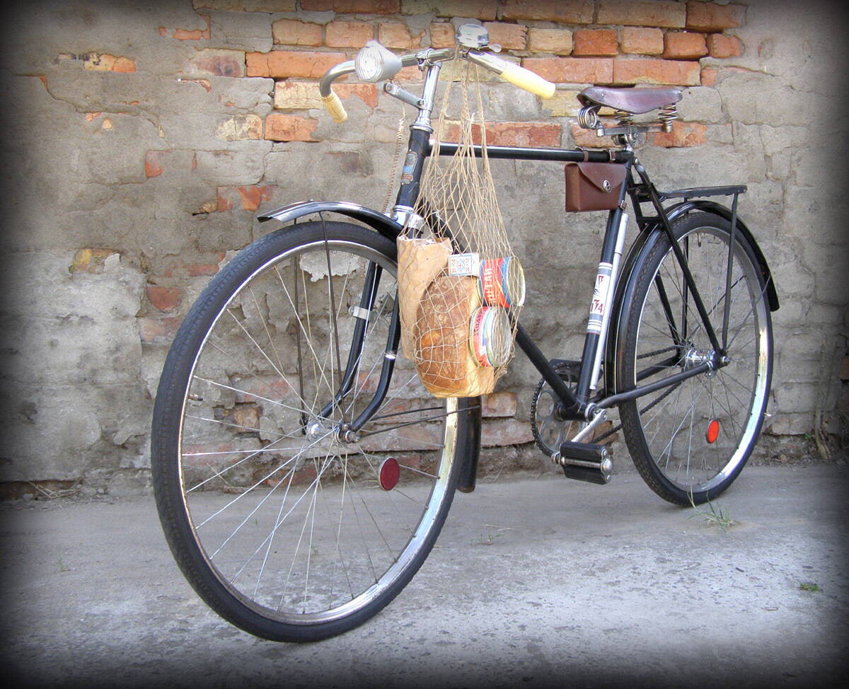 Все, что сетке ,кроме «хлебушка», реконструкция соответствует эпохе - средина 1970-х. Велосипед тоже настоящий, времен моей юности. Продовольственный набор сельский из «сільпо» не этого, а тогдашнего :smile: . В ті часи, у нас в селі молока в пекеті, чи в пляшці, вареної ковбаси або сиру я ніколи не бачив, та навіть не знав що таке буває.
