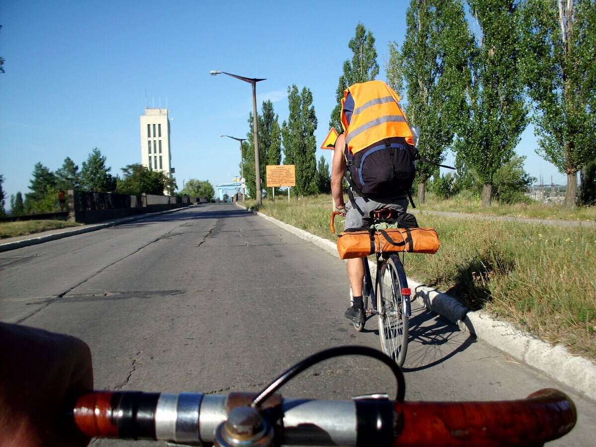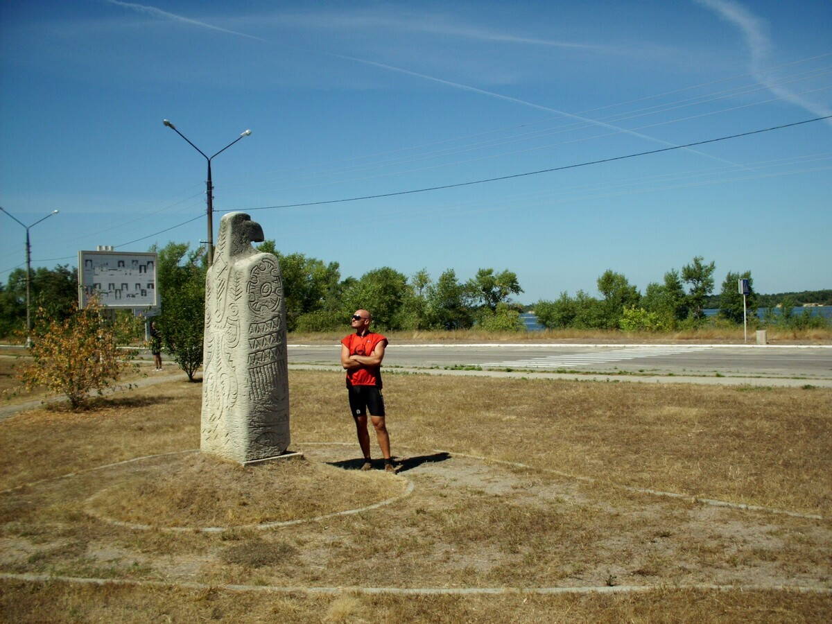 Даже по дворам, и «возле мусорника направо», когда я завёл группу в городские дебри, заблудившись :smile: . На большую дорогу выехали аж за городом. Тарасова гора находится на берегу Днепра (здесь уже не водохранилище – город расположен вниз по течению от плотины) в нескольких километрах за Каневом, к ней ведёт образцово-показательная специальная дорога.