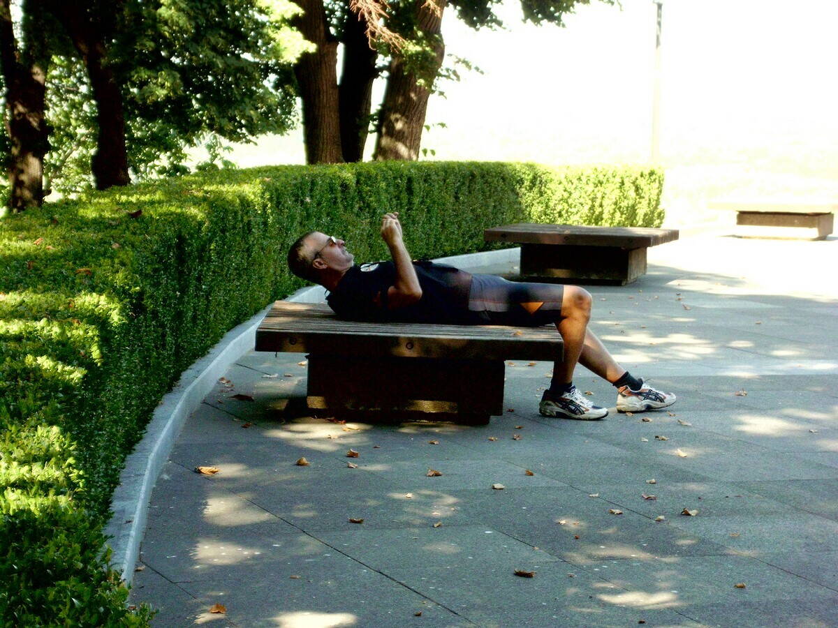 Ростик присел отдохнуть среди тех дубочков на специальной скамейке особым способом.