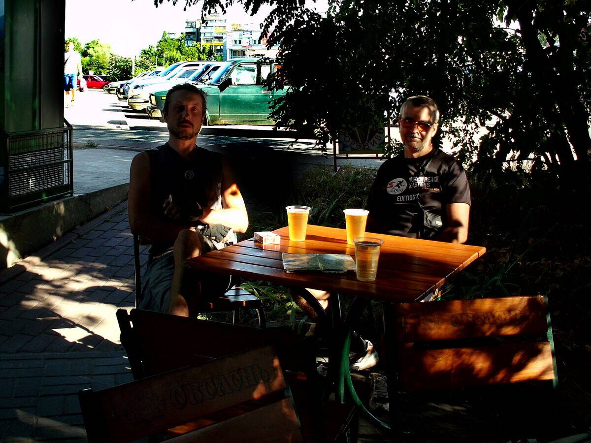Теперь это, наверное, ведущий алкобайк форума – ведь Степан съездил на нём аж из Киева в Канев попить пива! Что подтверждено фотографически и двумя свидетелями, а также этим отчётом. Ради этого бокала пришлось проехать в оба конца 360 км. Ему составил компанию Ростик с пивом и я с лимонадом.