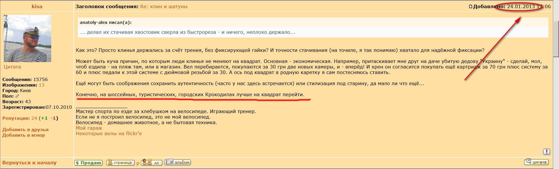 Ляпну и свои пять копеек по поводу квадрата и прочих окта ...линков по сравнению с клином, может заметили на барахолках очень часто продают б/у "современные" шатуны под восстановление с разорванным или треснутым телом шатуна какраз по квадрату или окто...? Покрайней мере лезли всё время в глаза пока искал систему на тандем. Вспомните что есть такое понятие концентратор напряжения. Вот, а в клиновой системе у шатуна нет концентратора напряжений, ведь отверстие круглое (к примеру при разделке трещин, во врея ремонта металлических узлов и конструкций, перед их заваркой всегда рассверливают конец трещин). Потому скорее шатун согнут или вал, если дури много, но чтоб порвать... Потому я смотрю на квадраты и всяке окто... как на потенциально опасные элементы в конструкции велосипеда.