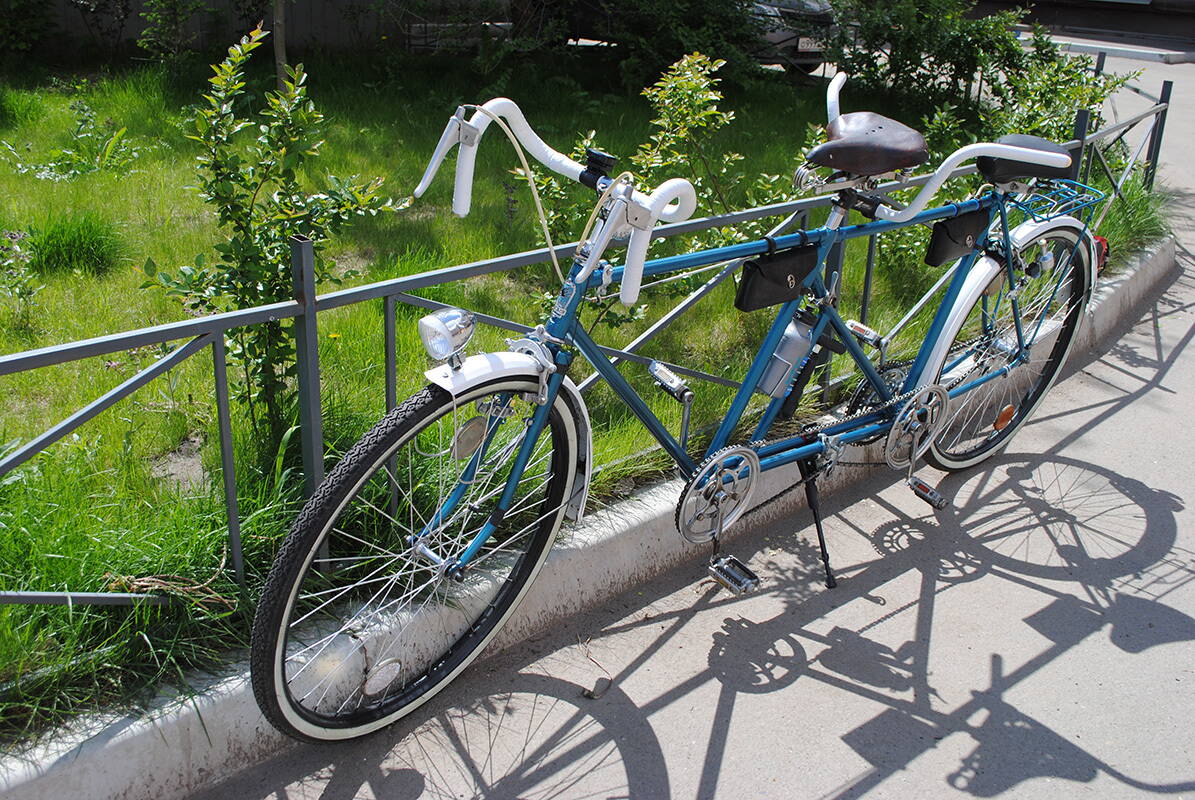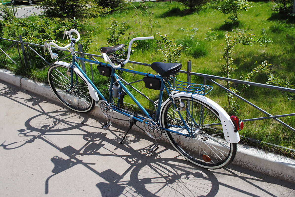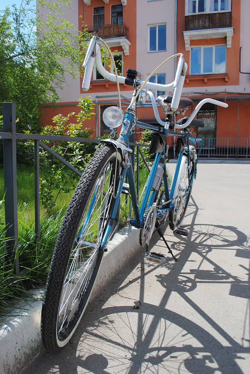 Вторая причина: банальное отсутствие денег «на апгрейд». Конечно, хотелось чего-то большего, чем характеристики стандартного ХВЗ 197 – 411 «Тандем» , ведь технологии идут вперед семимильными шагами, глупо это отрицать, а при должном уходе даже детали, купленные по вполне приемлемым ценам будут служить верой и правдой. Прогресс не стоит на месте, тандем штука тяжелая, а на безопасности экономить не стоит. Ему как воздух необходимы: как минимум 18 скоростей, хорошие тормоза (V-brake либо дисковые тормоза), надежные колеса (прочные и имеющие высокую степень жесткости на изгиб и скручивание двойные обода, с более высоким профилем), новая система ведущих звезд, которые изначально рассчитаны на установку только на картридж-каретку, а значит и замена советских кареток на современный «квадрат». Ресурс, как известно, есть у всего, а значит, как бы хорошо ни сохранились советские компоненты, рано или поздно неизбежен момент износа конусов на валах кареток, после которого наступает конец нормальному кручению. Постоянный люфт в каретке, стук и скрипы, как и разбитые клиньями гнезда, уже не способные нормально фиксировать шатуны постоянно будут напоминать о себе, не говоря уже о спицах ХВЗ, которые шли совсем уж тонкие, а обода по сравнению с современными двустенными и вовсе «бумажные», приобретают постоянные «восьмерки», а то и «яйцо» на обычном велосипеде и в принципе непригодны для тандема. Трансмиссию можно собрать лишь на 8-10 скоростей с соотношением 4х2 либо 5х2 , в современном мире этого, мягко говоря, недостаточно, не говоря уже об установке на тандем, для которого чем больше ряд пониженных передач – тем лучше. Да и как показывает практика: замена одного компонента потребует как по цепочке замены системы в сборе, либо данный «гибрид» будет работать некорректно. Восстановление советского велосипеда исключительно в оригинальном состоянии исключает возможность использовать его для комфортной езды на каждый день, т.к. он морально устарел. Это подходит для музеев, частных коллекций, но в современном мире не конкурентоспособно! В общем, детали приходилось докупать постепенно, это продолжалось до тех пор, пока не были собраны абсолютно все требуемые компоненты для переделки под желаемую конфигурацию. А пока тандем активно использовался, ведь негоже короткое сибирское лето велосипедисту проводить пешеходом.