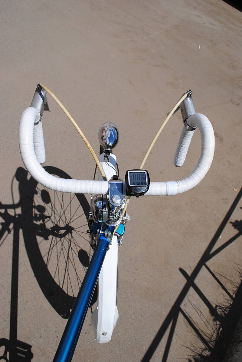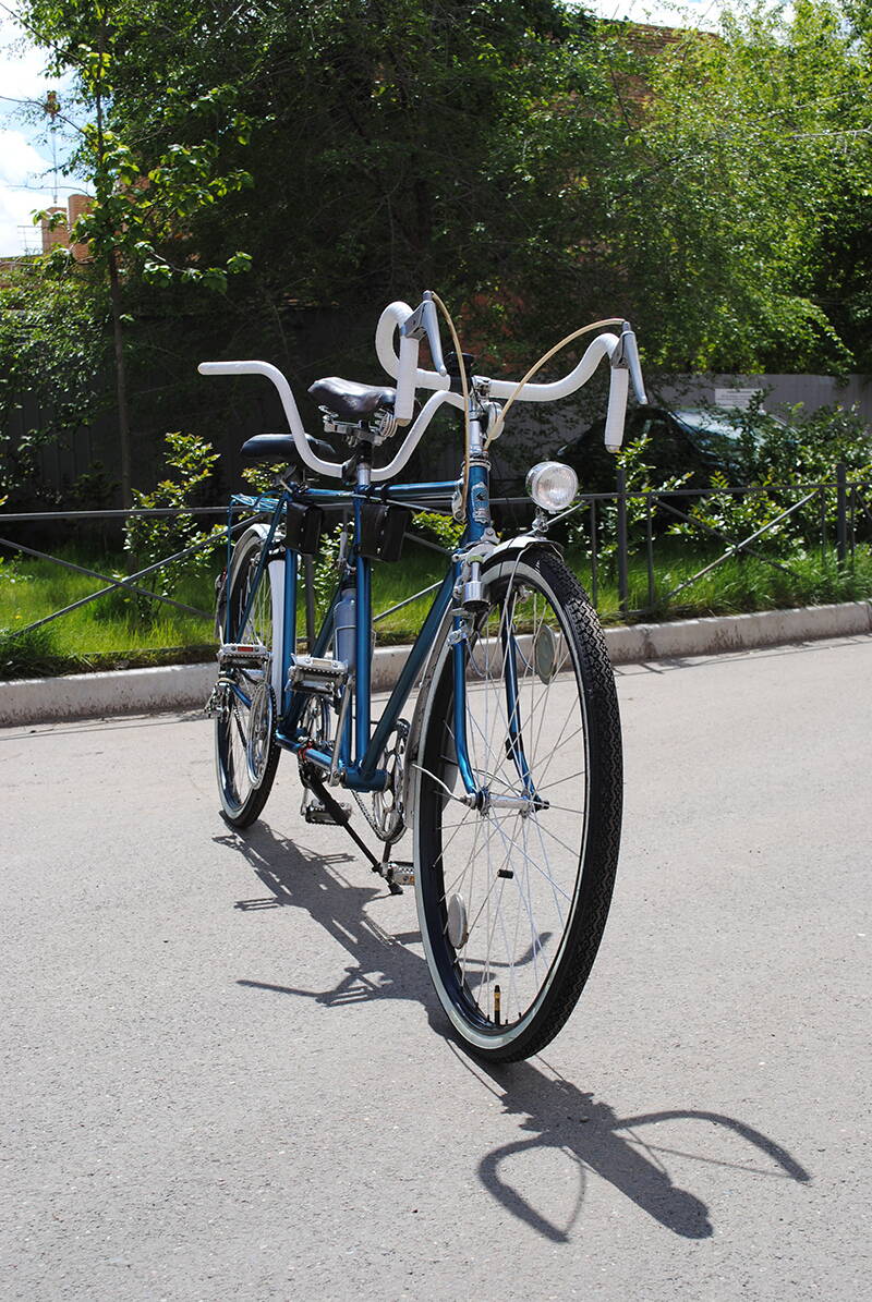 Задняя часть рамы — от велосипеда «Турист» (не претерпевает никаких изменений и от нее ничего не отрезается ,она приваривается без каких либо изменений, некоторые, например, отрезают рулевой стакан полностью и удлиняя трубы приваривают к подседельной трубе первой рамы и т.д.) В моем случае рулевой стакан "Туриста" распиливается вдоль точно посередине с правой стороны ,разгибается,плотно надевается на подседельную трубу "Урала" и фиксируется сваркой. Подседельный штырь не регулируется по высоте, просто вбит до нужного мне уровня, это в свою очередь придает повышенную прочность сварной сцепке, он вбит внутрь примерно на две трети, так что перекрывает по длине всю бывшую рулевую рамы Туриста, получается своеобразный палец. Между каретками проходит усилительное ребро в виде двух параллельно идущих труб,надетых с одной стороны на обрубки нижних перьев "Урала" до упора и заваренных по верху, с другой стороны трубы приварены к каретке "Туриста". Передняя часть выполнена из рамы велосипеда «Урал» 1978 г.в. Передняя вилка также от «Туриста». Обода колес — «Урал»; резина и спицы — от дорожной модели велосипеда. Предусмотрен тройной независимый контур тормозов. Рукоятка привода тормоза переднего колеса установлена на левой половине руля; рукоятка привода тормоза заднего колеса установлены на правой половине руля . Т.к. заднее колесо от «Урала» то имеет место старый добрый барабанный тормоз с внутренним расположением колодок и ведомую звезду на 19 зубьев . Тормозить им очень удобно, в планах поставить планетарную втулку чтобы при наличии пониженных передач для облегчения жизни на подъёмах не потерять возможность торможения педалями , но даже сейчас в более менее крутые подьемы односкоростной тандем способен взбираться самостоятельно. На нижней ветви цепи установлен компенсатор, что позволяет исключить требование жесткой синхронизации; уменьшает износ и вытягивание цепи при «жестком» усложненном профиле дороги. Под седлом водителя,на подседельном штыре установлен вынос для размещения второго руля, которое позволяет регулировать его установку по высоте и углу наклона ручек. На переднем и заднем крыльях установлены фары, питание которых осуществляется от двух динамо-генераторов, в планах поставить аккумуляторную батарею. На данный момент пройдено более 200 км , и можно отметить следующие характерные эксплуатационные особенности предлагаемого велосипеда-тандема: