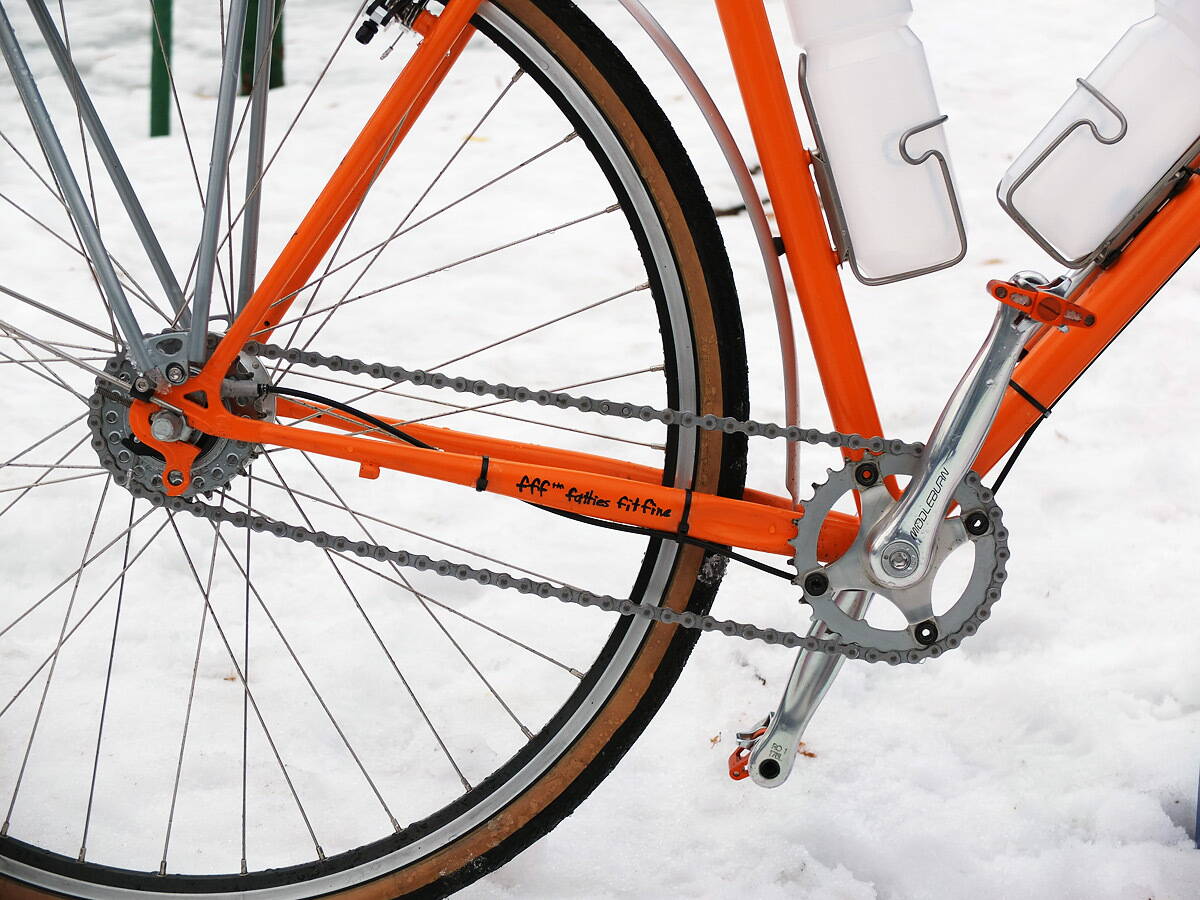 Ну, в общем-то, оно поехало. Пока с горем пополам доехал от магазина домой километров семь: в цивильной одёже и обувке (на контактах, ага), по грязноснежной каше, с неприкатанным седлом, недоделанной посадкой (требуются исследования), почти без тормозов (колодки не притёрлись). Но, чёрт побери, оно едет, да ещё как! Приехал чистым, крылья спасают.
