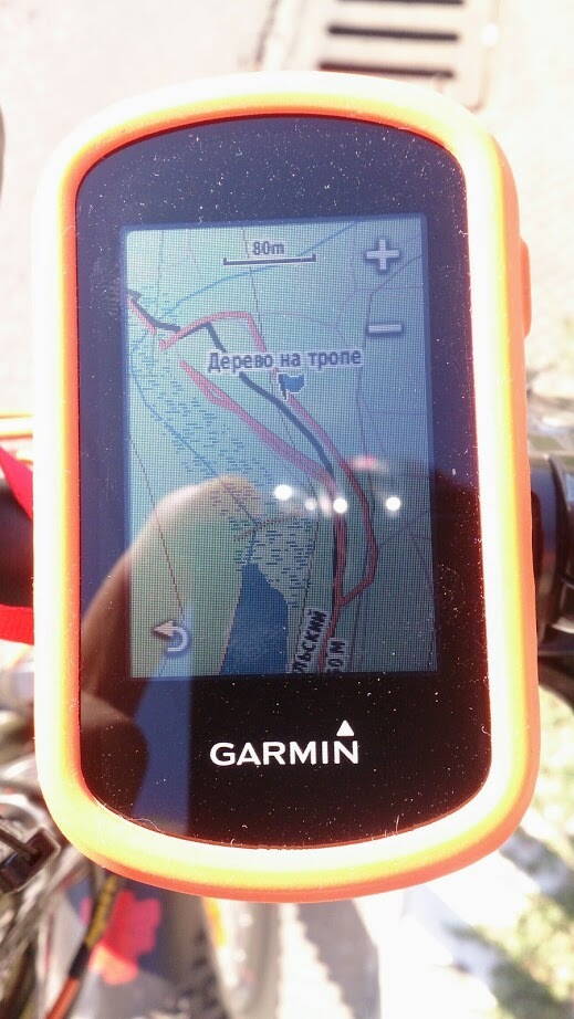 Трек нарисован в том месте между двумя тропами на самом деле и перехода между ними нет (фото экрана навигатора), оранжевым - там где именно проходит тропа с поваленным деревом (по верхнему уровню), зеленым - отмечен лучший участок для проезда (по нижнему уровню склона), тропа там накатана и очень веселая :D и без завалов.