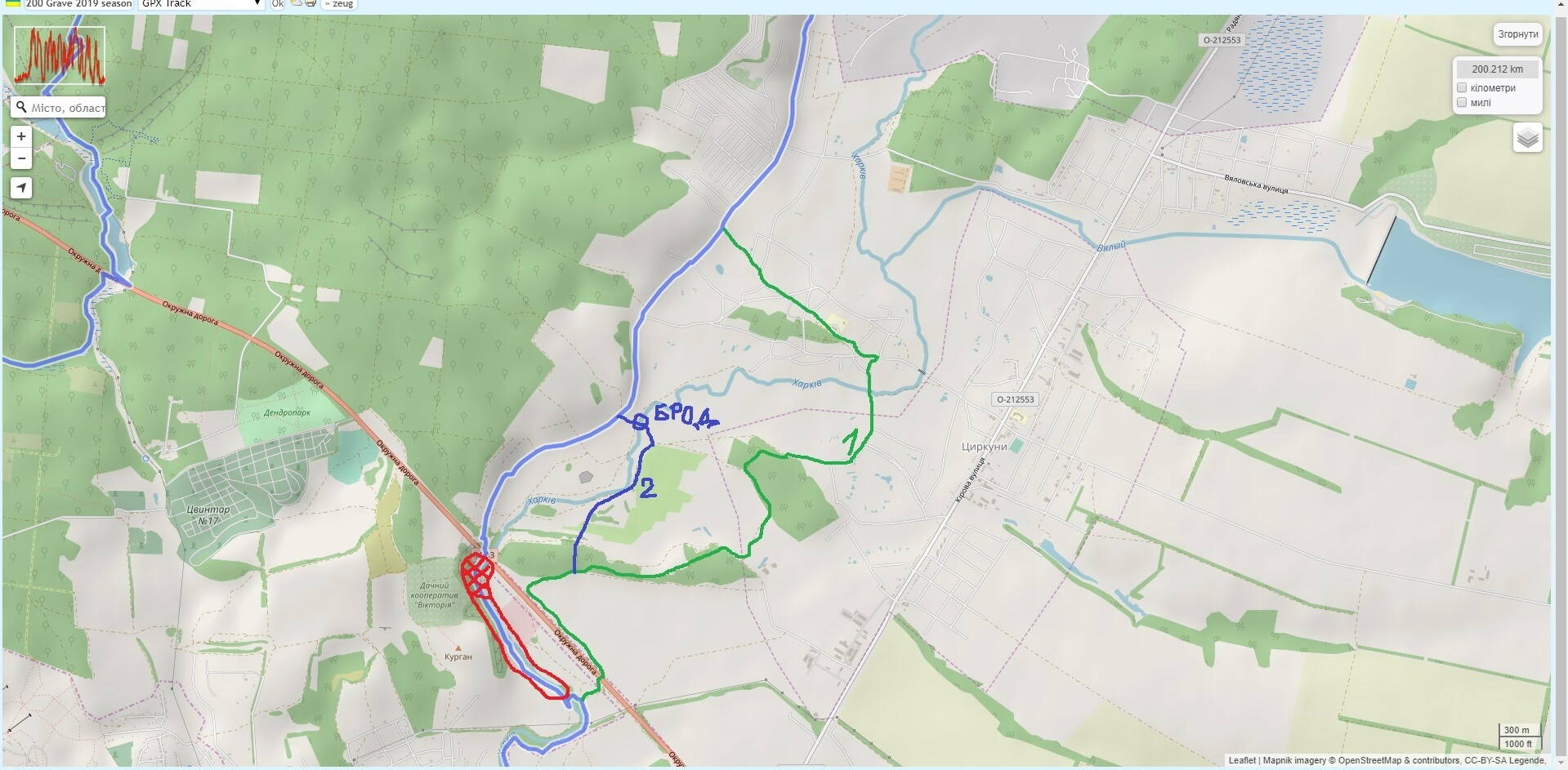 Старт со сквера Героев небесной Сотни и далее вдоль реки Харьков через Семиозерье мимо Фельдман-парка и через лесопарк на трейл по старой танковой дороге. Далее через Семеновку, Полевую и Феськи по дамбе Рогозянского водохранилища и через Гуриновку до Сковородиновки. Назад через Горького и урочище Шматово мимо Высоты Конева через Рыжов и Ледное вдоль реки Лопань на финиш на месте старта.