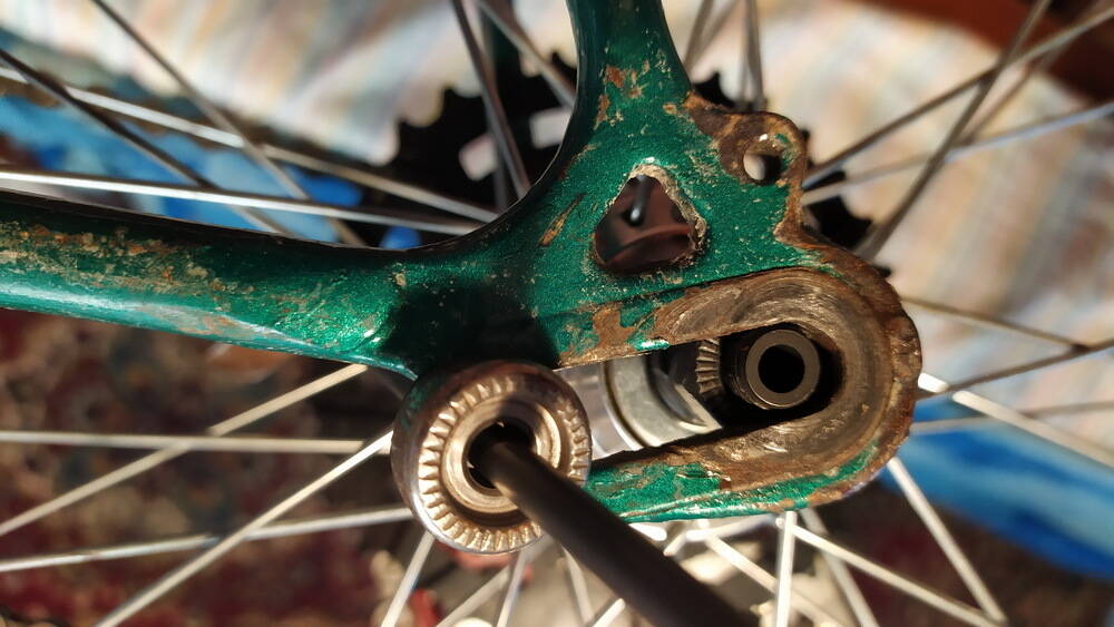 Даже при предельной затяжке (боюсь что лопнет) правая часть оси сдвигается вперёд и колесо начинает тереть левое нижнее перо.