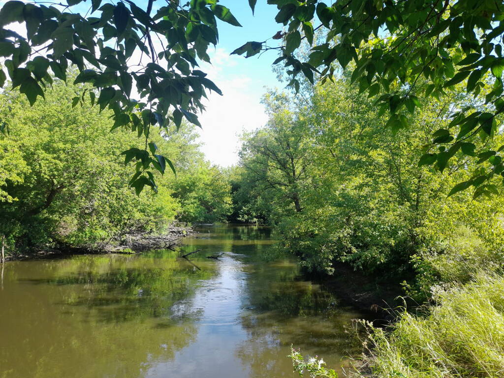Метров 200, с начала маршрута, что-то наподобие тропы таки было, дальше — сплошной мрак..., мы выкосили уйму травы, разобрали немерено завалов и спилили мешающие нам деревья (инвазивные). Если посмотреть на карту, можно увидеть, что дорога есть, она проходит по лугу и в паре мест практически соприкасается с нашим маршрутом, но, её разбивают машины и квадроциклы, после дождей образовываются лужи..., из-за этого, нам и приходится воздвигать мосты, дабы вообще не выезжать на неё.