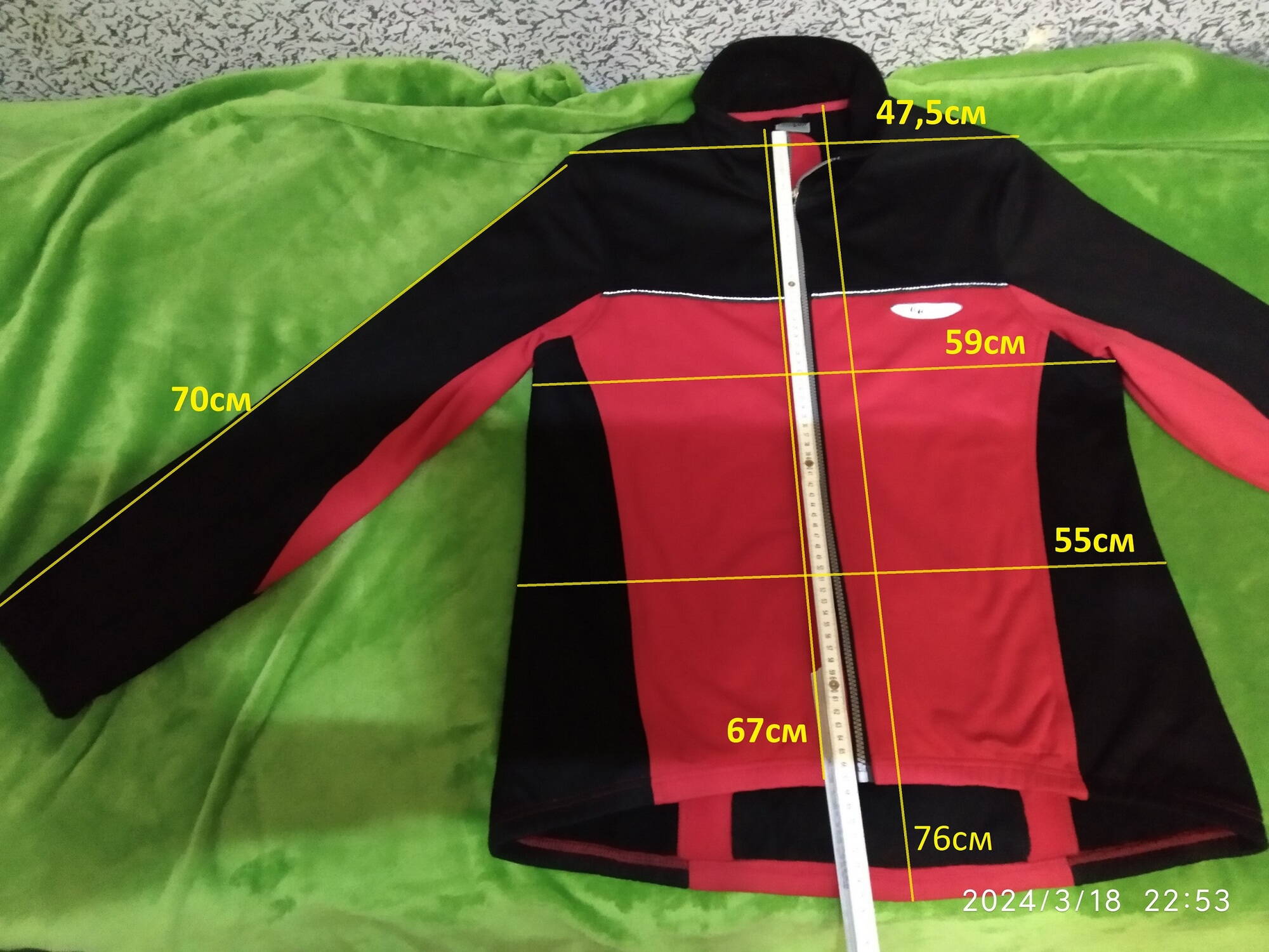 Вело куртка SHAMP size L -- с переди мембрана (виндстопер) с флисом внутри, на спине верх черное тоже мембрана, остальное красное флис для лучшей вентиляции. Местами есть зацепки. Материал хорошо тянется.