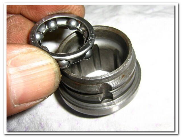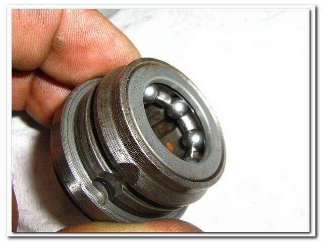 Дальше удобней работать,закрепив втулку в тисках вертикально.Устанавливаем большую пружину и подшипник(просто ставим-и всё):