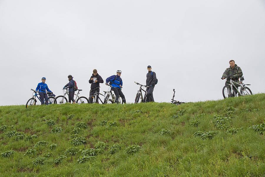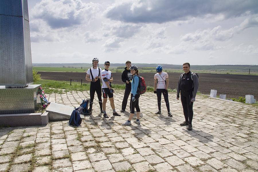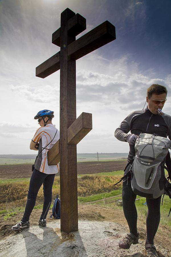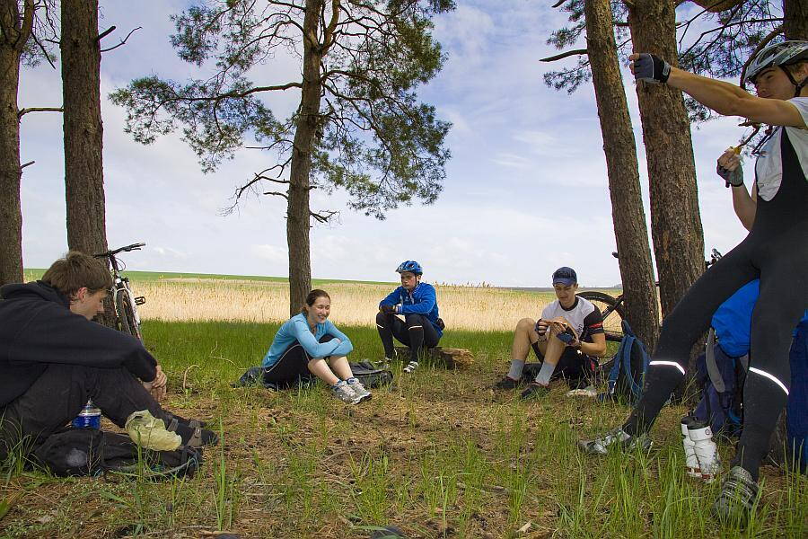 Выезжаем из села и сворачиваем на почти незаметную колею, проложенную между лесопосадкой и лесом; дорога несколько влажная, и почти неукатанная, к тому же - изрытая слепышами, а потому ехать по ней весьма тяжно, но никто не жалуется! Последний участок - с горки, но практически по чистому полю. А точнее - по минному полю, так как пустошь усеяна мелкими ветками шиповника, покрытыми острыми крепкими шипами, легко пробивающими велосипедную шину при малейшей возможности