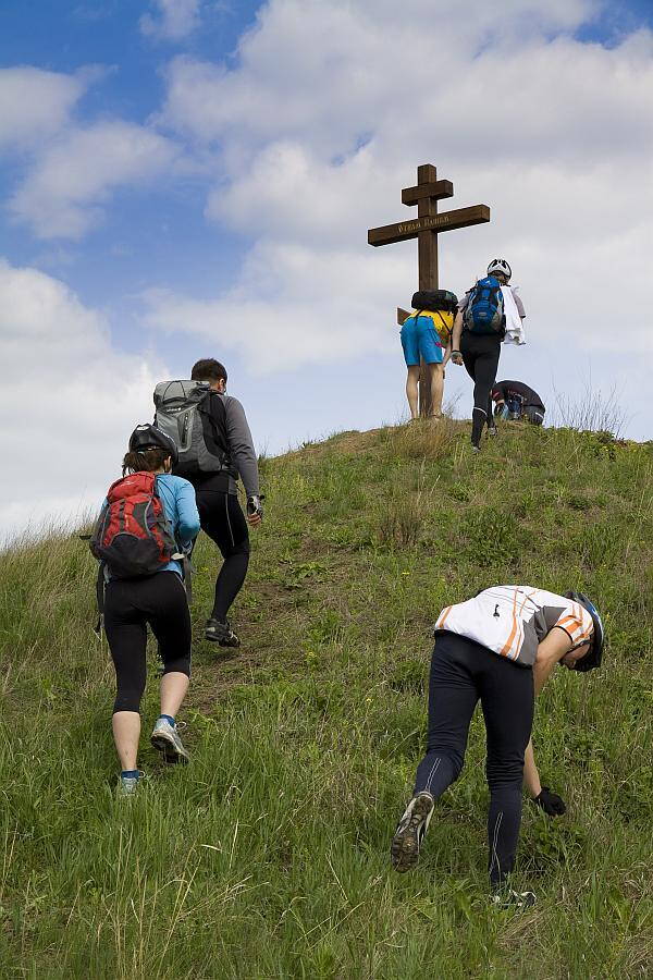 В центре сворачиваем на грунтовку, и почти сразу же начинается достаточно крутой подъем по не вполне просохшей после дождя глинисто-меловой дороге, который группа преодолевает пешим порядком. Местная детвора снова приветствует нашу компанию
