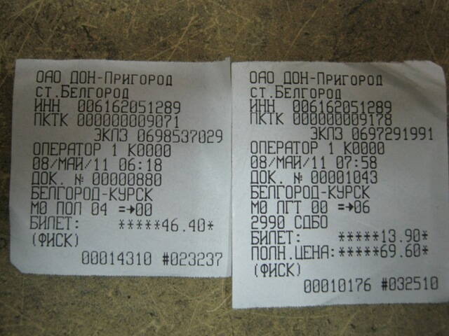 Привет! Среди единомышленников была объявлена геокешерская покатуха по Белгородской области приуроченая ко Дню Победы 9 Мая. По уважительным причинам некоторые участники отсеялись и я отправился один. Я не сочинитель, поэтому как получится. В отчете на територрии России я буду оперировать суммами в рублях и временем московским. Все фотографии в соответсвующих фотоальбомах тайников. Начало.7-е число меня обмануло, обещали дождь, было сухо, думаю, хорошо поеду 8-го, как раз дорога подсохла, был уже собран и отправился в Казачью Лопань на электричке в 0:54, около 2-х был там, что-то стало холодать, чтобы не ждать Белгородскую электричку отправлением в 4:10 решил поехать самоходом, как раз границу проеду, еще ни разу не проезжал, и в Наумовке сяду на эту же электричку. Так и сделал. Через границу прошел без проблем, даже не спрашивали, что везу ни наши ни россияне, доехал до Наумовкм, сел на электричку,билет до Белгорода стоит 46-40 в рублях. Подъезжая к Белгороду начался дождь, думаю, вот попал, но обратного пути уже не было, Прохоровка была намечена при любой погоде, тем более там асфальт(как я ошибался). В Белгород приехали в 6-50, электричка на Ржаву(курское направление) в 7-34. Вторая неприятность меня настигла уже в электричке, при покупке билета(пригородняя касса на улице и под дождем мне мокнуть не хотелось). Так вот, если я гражданин Россия то мне билет из Белгорода до Танкового поля обойдется в 13-90, на мне же не написано, что я из Украины контроллер мне и выбил билет на эту сумму, а я по незнанию или неопытности, и ляпнул откуда я и куда еду, как он обрадовался, не передать словами, но и с ними можно договориться, я дал полтинник, 36 рублей он себе в карман положил, думаю, электрички российские, вы меня больше не увидите, или если и буду ездить рубаху на себе рвать буду,что паспорт дома забыл а сам из какой нить деревни... Это я немного приврал, но суть такова, как обяснил мне контроллер, если бы у меня был Российский паспорт и Белгородская прописка я мог-бы купить билет по льготной цене а не по полной.