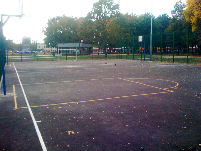 асфальтик ровненький,площадка огорожена со всех сторон,есть ворота футбольные.