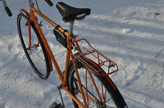 Это да, жалко когда такие аппараты гниют по углам. Этот оранжевый сделал для друга в подарок. Корпел над ним с нового года, отдал в хорошие руки, да и вдвоем кататься веселее. Кстати из неродного только 3 спицы китайские, покрышки родные под вопросом(трещщин нет но вел стоял на сдутых колесах несколько лет- покрыхи повело), вел на удивление сохранился, но перебирать пришлось все, даже седло. Кстати перед фотосессией покатался на нем по снегу-экстрим....