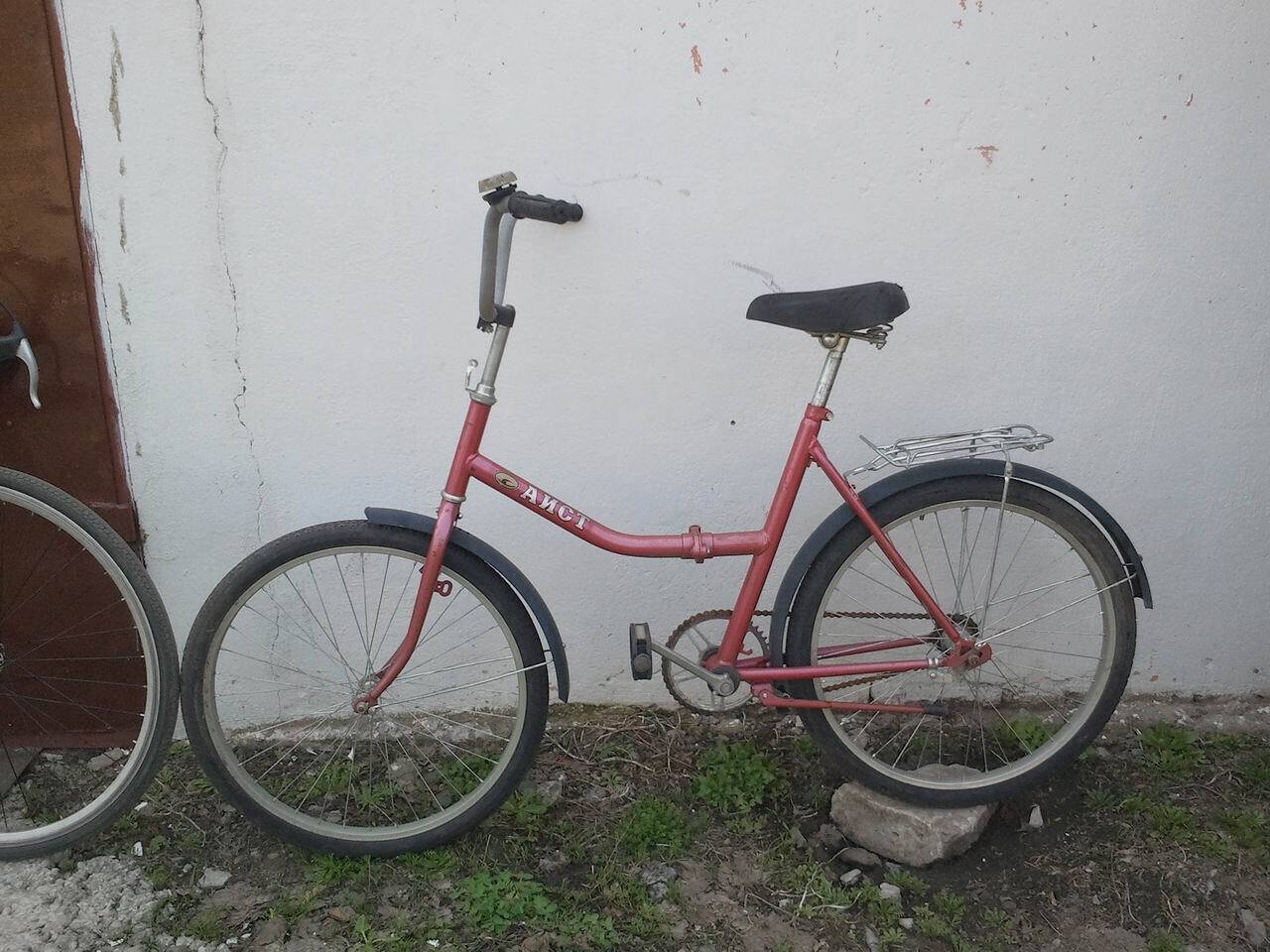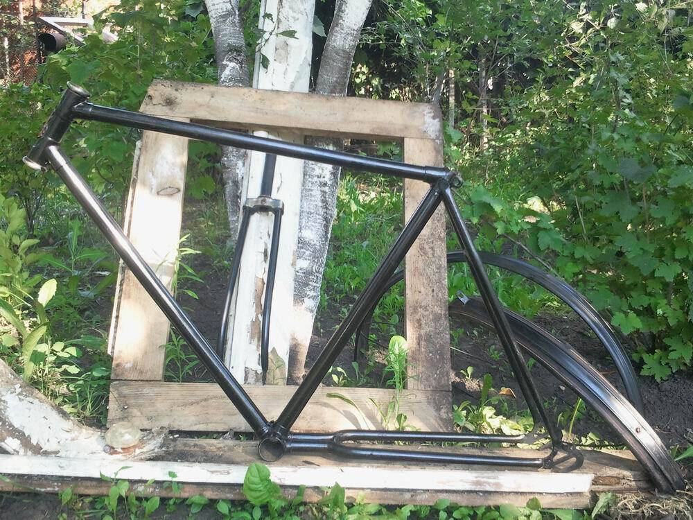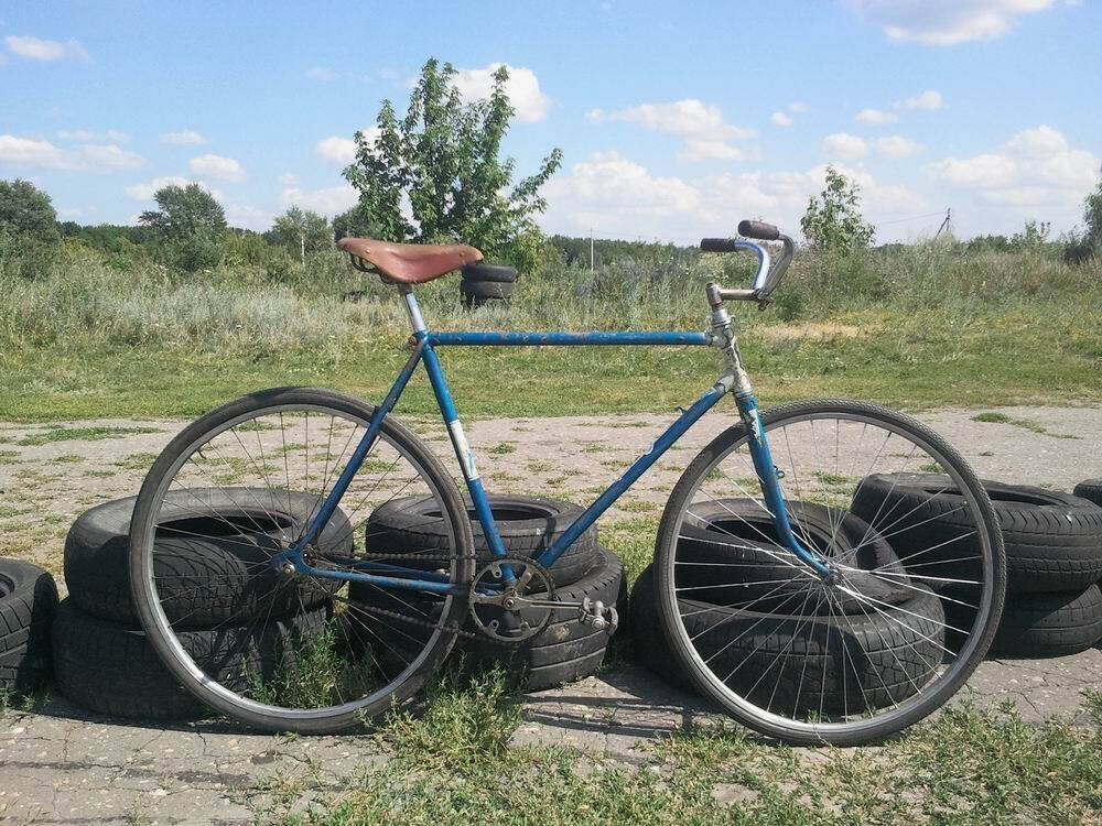 Спутник В-301 1971 года, досталась мне рама, вилка, руль, седло, заднее колесо и цепь. За несколько дней переспецивал колеса, поставил обода от туриста, перебрал втулки, поставил каретку с шатунами от стартона, педали от дорожника. Временно из него сделал фикс без тормозов, передача 53 на 16, стоит родная трехскоростная 14,16,20. Два раза не нем прокатился, едем неплохо, но в ближайшее время предстоит перекраска в голубой цвет, поставлю крялья и тормоза, пятерик стартоновский и звезду на 51.