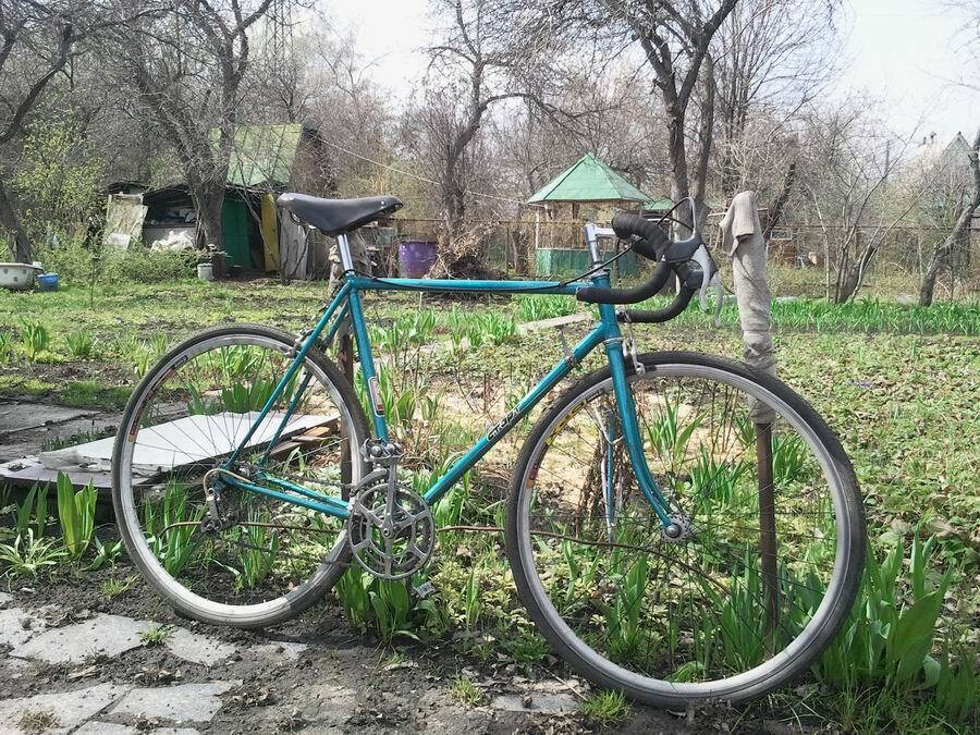 Старт шоссе В-555 1973 года. Досталась в декабре рама вместе с задним переключателем, поэтому зимой постепенно собрал колеса, поставил вилку, вынос с рулем тормозами, подсельный штырь с седлом, педали с тупликсами и ремешками, систему трехлапку 40-51 и 14-22. Поменял родные колодки на альхонгавские, сразу выросла сила замедления и исчез собачий визг :D . Ездил на нем недавно в Липецк