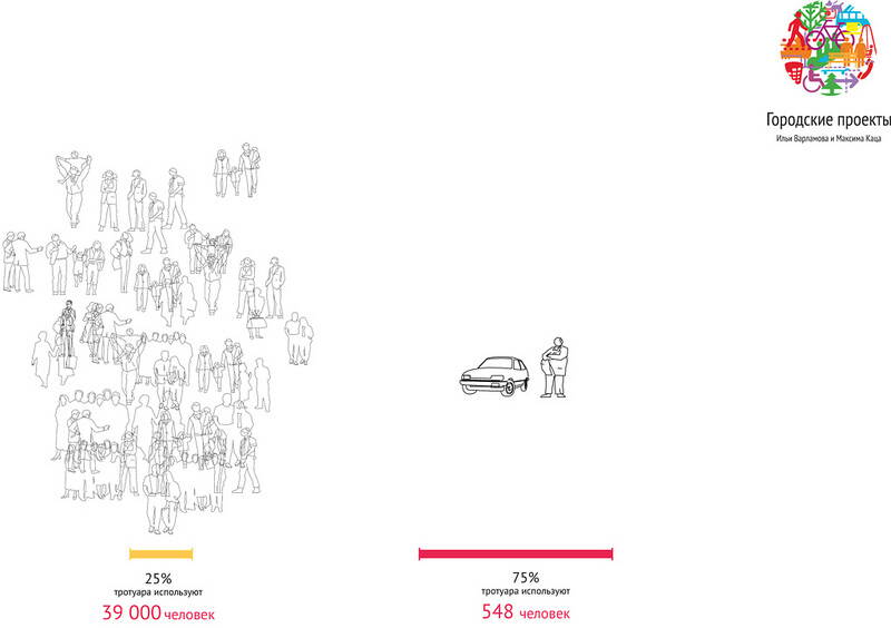 Мэрия, которая распределяет разнообразные ресурсы в городе, распределила площадь тротуара в пропорции 1 к 67. Автомобилисты имеют примерно в 67 раз больше площади тротуара, чем люди, которые автомобилем не пользуются.