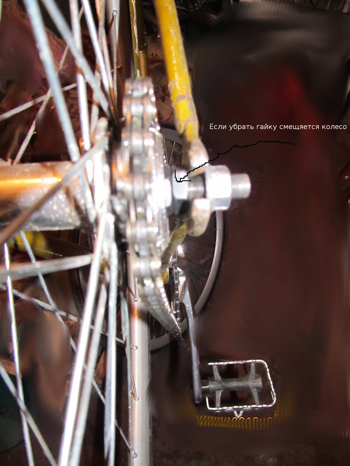 Рама рекорд, каретка 107, система н Sturmey Archer заднее колесо бралось в сборе аванти на промподшибниках, лочили знакомые. Не могу никак выставить линию скоса, система на каретке стоит нормально зазор минимальный между шатуном и цоколем рамы под каретку, на заднем колесе со стороны звезды на осе накручено 2 гайки, если гайку убрать то смещается колесо, если сзади посмотреть то становится не по центру. Так как на фото впринципе езжу нормально нет ни треска ни скида цепи, но все таки чайнлан думаю на процентах 80 допустимой нормы. Всетаки беспокоит етот факт и хотелось бы его исправить. Подскажите как ето сделать. Я так понимаю что идеальное решение ето если б на оси перед залоченной звездой был бы выступ больше чтоб сама звезда была смещена на пару сантиметров по резьбе от оси то было бы гдето так как надо. Подскажите чтоможно предпринять?