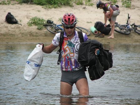 Третій день був, мабуть, найнасиченіший! Тобто, враження и побачене йшло по «наростаючій»… Ранок видався дуже гарний, ми вирішили їхати грунтами на Опішне. Зачепивши краєчок Котельви, ми посунули через Млинки і Глинське, об’їжджаючи калюжі, яких було все ще вдосталь. Десь там далі ми дізнались від місцевих жителів, що щоб потрапити у Глинське, треба форсувати Ворсклу убрід! Що робити? Ми на якусь мить штучно натягнули на обличчя «приречений» вигляд, але в очах багатьох червоними літерами було прописано «Йєс! Оце так пригоди чекають! Гайда, мерщій туди!». Та тим більше, що це ж не ми самі дурні так захотіли (убрід), а «тіпа, так вимагає від нас ситуація». Екстрим прийшовся як раз до смаку усім, як мені здалося.Досягли Ворскли, спостерегли за місцевими, яка глибина максимальна, та який там фарватер для переходу… Прикинули, що велошорти можна підкотити і «памперс» не повинен намокнути, якщо помалу… Першим пішов Льоха.
