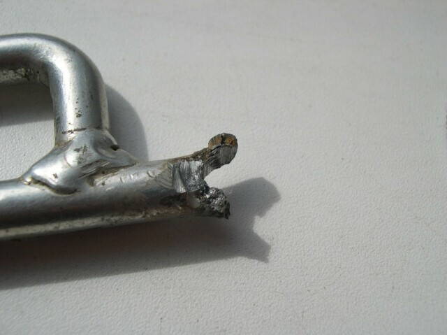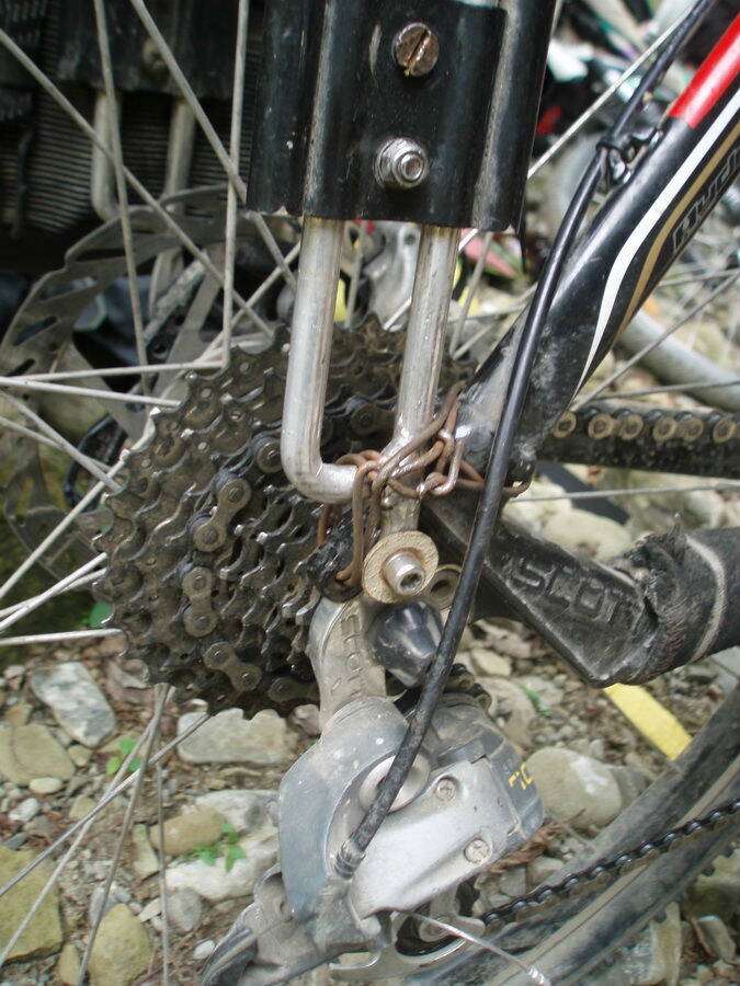 15.20. Закончив чревоугодие, собираемся выдвигаться. Вовка покопался в картах и вроде нашел еще одну грунтовку, которая может вывести к Снидавке. Попытались на нее выбраться, но уткнувшись в тупик у лесопилки, где нас разочаровали, мол не проедем надо чуть вернуться в село. Ладно, значит возвращаемся в Шепит. Как раз только доехали до разворота дороги ниже маленького водопада, замечаю нештатный треск в заднем колесе. Останавливаюсь, вот напасть, лопнула стойка багажника, в месте, где проходит болт, фиксирующийся в нижней части пера.... Приехали.