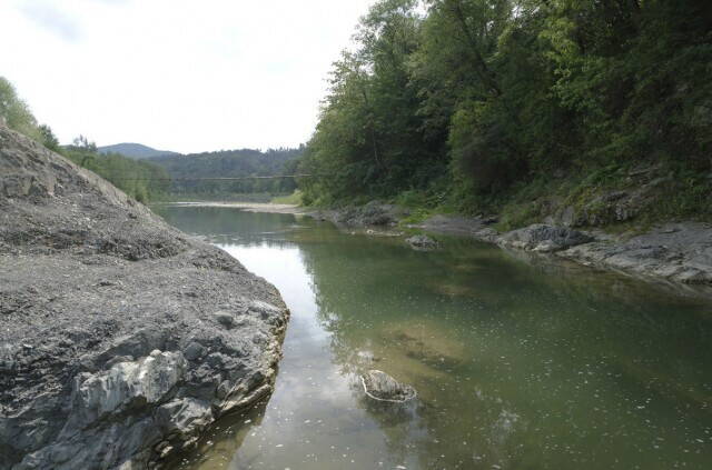 По карте из центра села идет «дорога с покрытием», но это покрытие совсем не асфальт. По укатанному гравию то уже даже привычно ехать, но с грузом по нему разгоняться опасно, велосипед порой заметно бросает в бок. Так что приходиться ехать по крутому спуску постоянно притормаживая, что совсем не радует. Дорога постепенно спустилась на дно ущелья, и рядом у реки стали появляться перспективные места для лагеря. Уйдя на тропу вдоль речки, удалились от дороги, которая шла выше, и вскоре нашли подходящую полянку.