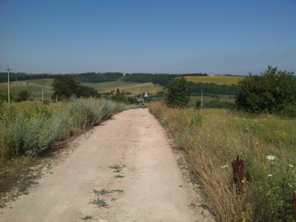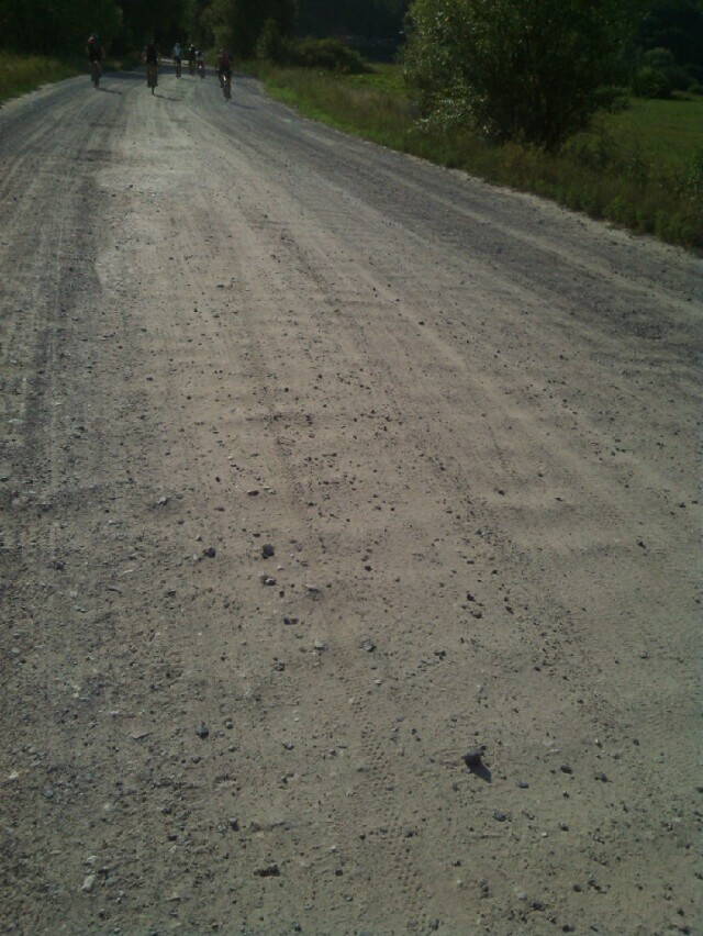 Четыре часа утра все ещё свеженькие, у всех хватает сил поднять большой палец или даже две руки, но недолго музыка играла. Поехали мы к протопоповке, она нас встретила замечательным тягуном на котом мы все так чудно разогрк=елись, что пришлось тутже раздеваться и складывать всю одежлу в рюкзаки. Поднялось солнце и расход воды, ну лично мой подскочил до невероятных высот, выпивал где-то литр в час или даже полтора. С собой вез гидратор на 2 литра в рюкзаке плюс литровая бутылка в подфляжние. К счастью дворов и колодцев где можно было набрать воды хватало, посему я продолжал движение.