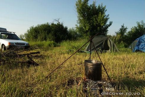 Ночевка была запланирована на берегу речки Гайчур в пяти километрах от Гуляйполя. Место идеальное с точки зрения безопасности и комфорта, единственный недостаток — посреди лугов было сложно найти хворост для костра, так что в ход пошел сухой кустарник. Лагерь разбили быстро, но готовить еду и ужинать пришлось уже в темноте.