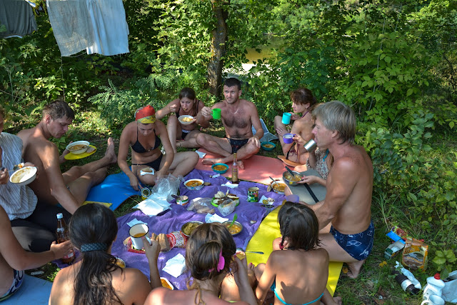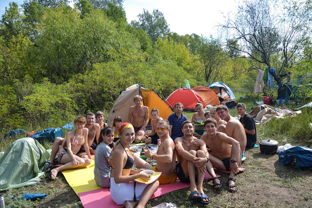 Потом начался хаос. Приплыли мы как всегда затемно. Забазировались недалеко от с. Михайловка. Хаос продолжался. Кто-то что-то терял, кто-то ставил палатки, кто-то просто метался по лагерю. После ужина все устаканилось, но кажется без "Бабы Вали";-) Сытный ужин. Отбой...