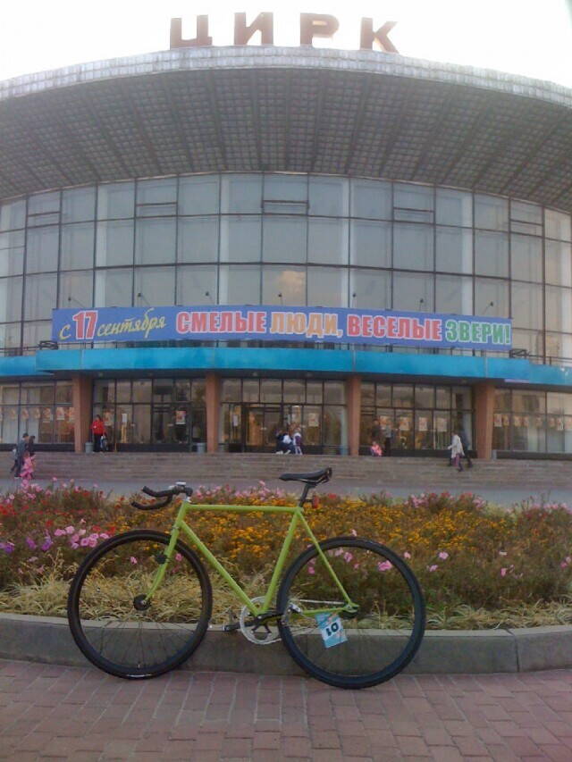 Пока я туплю и пытаюсь запустить Endomondo – все уже уезжают. Стараюсь не особо рвать, а просто усидеть на хвосте. Спок-карта, вставленная в два креста сразу же заворачивается от потока воздуха и начинает лупить по цепи. Решаю поправить её на первой точке и качу дальше с весёлым хлопаньем и треском. Впереди меня видно только Тришена. Подкатываюсь к цирку и пока все едут к входу, ставлю вел к забору не той стороной