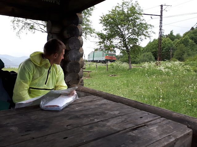 Переходимо на трасу Львів-Ужгород і біля блок-посту прикордонників повертаємо вправо до альтанки. Ми планували ще пройти хоча б з 10-15 км, але тут в альтанці сиділи харків'яни з великою поляною))) ми їм дуже сподобались і вони нас запросили до себе на "5 хв", які переросли в 2+год)) Коли вже стемніло, то ми глянули на дощ і болото, потім на альтанку... "Завтра пройдемо станемо раніше і пройдемо 50 км!")) І вирішили тут заночувати))