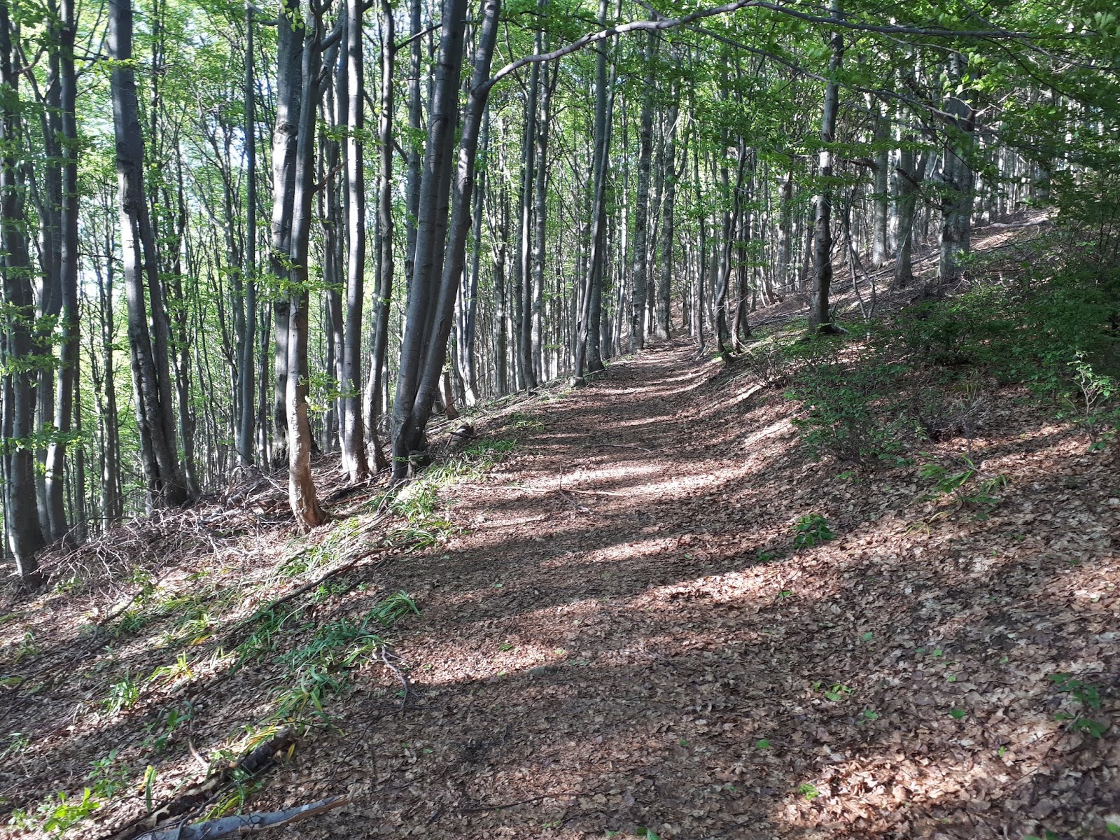 Маршрут огинає г. Юда верх і далі треба бути уважним, щоб вийти саме на червоний маршрут (якщо Вам треба на ЗТШ), стежка трохи заросла травою і можна прогледіти її, тому зверніть увагу на червону стрілку на дереві за 20 м і звіртесь з картою чи GPS. Далі заходимо в буковий ліс. Маркування хороше, хоча видно, що тут не так часто ходять туристи. Місцями є невеликий бурелом, але суттєво він не заважає. Так спускаємось до Дубового гаю.