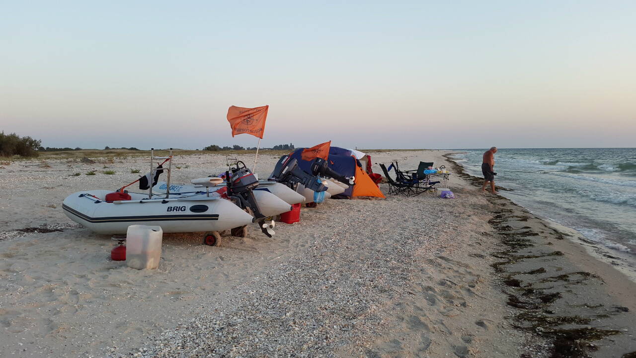 Найдя пляж поровнее и пошире, не доходя до Тендровского маяка, мы высадились на берег. Море тут голубое и чистое, а на берегу валяются тонны раковин рапана...