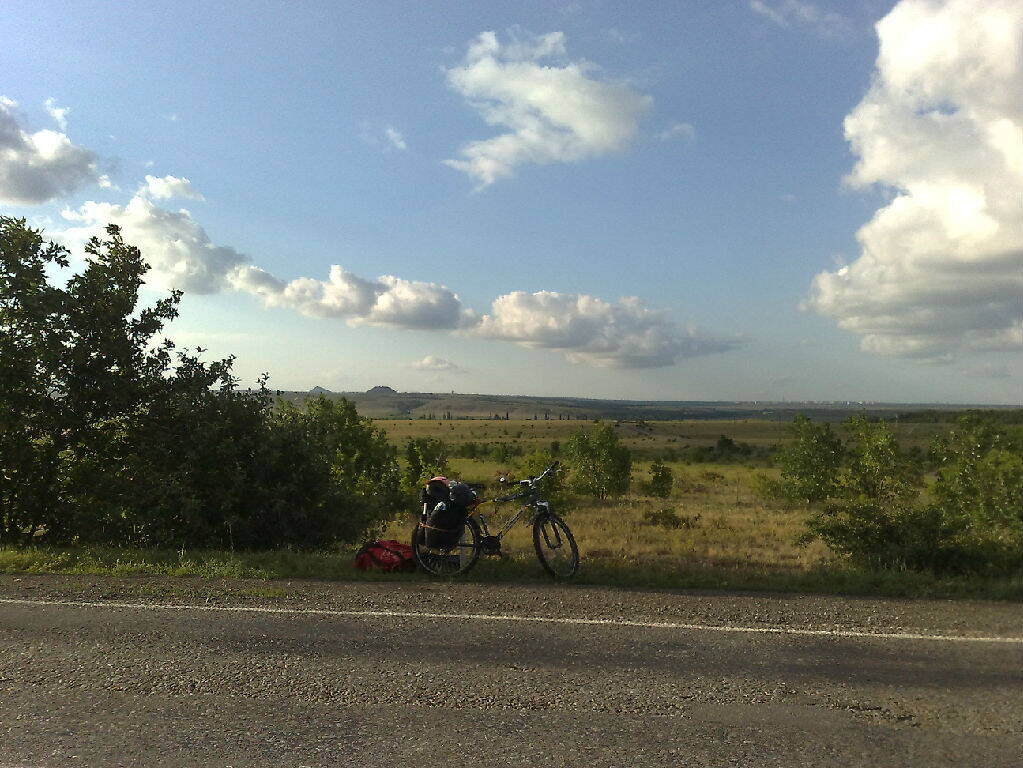 В Новошахтинске спросил дорогу у водил какой-то строй базы и они мне подсказали "хитрую " до Ростова .по которой я и поехал.Теперь пару слов о самих дорогах! ....... Ровные как стекло без ям и бугров . обочина.ну та часть которая отмечена разметкой. метра полтора а то и два. там может еще легвушка ехать ! Но ни кто не едет и я как царь дорог в ветром у ушах стал покорять просторы России1))))Фуры правда едут далеко за 100 км но что мнне фуры если они проезжают в двух метрах от меня (попутные) Если по Украине они проезжали едва не цепляя меня зеркалом. А тут еще и ветерок задул в спину !! Но время за полдень решаю передохнуть ... сьезжаю с дороги нахожу место и... Кажется дождь собираеться .Порыв ветра свалил дерево правда в дали от меня . и тут я понял что такой шанс упускать нельзя ! в коем веке попутный ветер. да еще с такой силой .Хорошо что еще не распаковался. Промчался я не крутя педали километрв 20 . и только порой наоборот притормаживая !!!! Дождь меня так и не догнал а я и отдохнул и путь сократил.)))) ПЕред Ростовом стал на ночлег . с выбором места тут было посложнее , все распахано и засажено. Попивая кофе смотрел я на вечернее зарево огромного города.