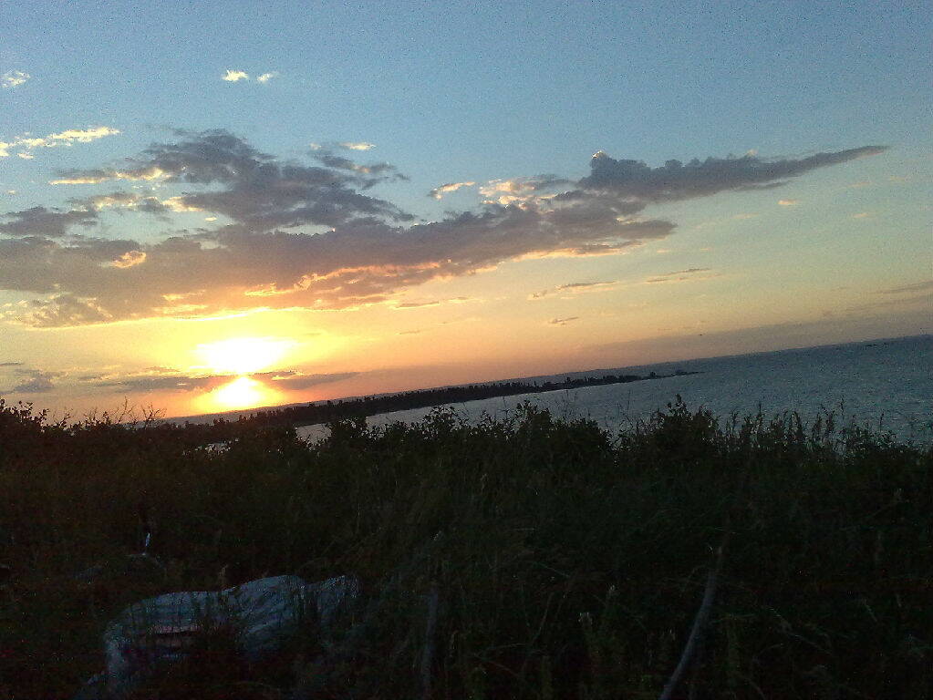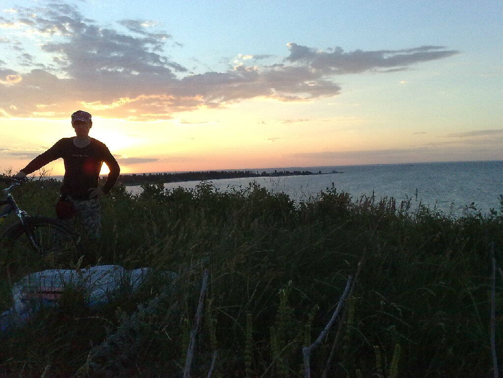 Здесь я впервые за время свого путешествия развел костёр . В траве было ОГРОМНОЕ множество насекомых очень похожих на комаров но размером чуть меньше кузнечиков и зеленые . Как оказалось вполне безобидных Огромное множество это полностью облепленные стебли травы. Я мелкими шагами начная с центра по спирали разогнал их за територию своего лагеря. Они даже не пытались вернуться ))) Один из лучших вечеров путешествия.Вон там на заднем плане виднеется песчанная коса А на ней мзыка М.С. ведет программу у меня горит костер , а там дальше на горизонте уже видны огни Ейска!!! Я так прикидывал ну если через море по прямой то километров 10-15 не больше , а по суше предстояло больше 100.
