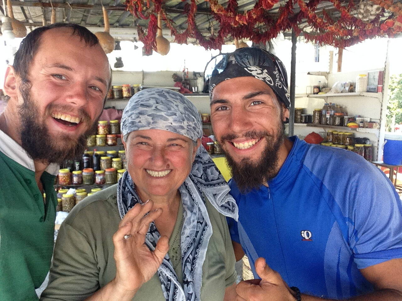 Нас позвали и мы присоеденились к распитию гранатово-апельсинового фреша с долькой лайма. На закуску был охлажденный арбуз. Мы немного поговорили о велосипедах и нашем маршруте, и конечно фото на память!))
