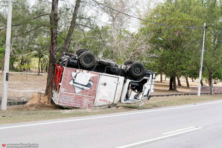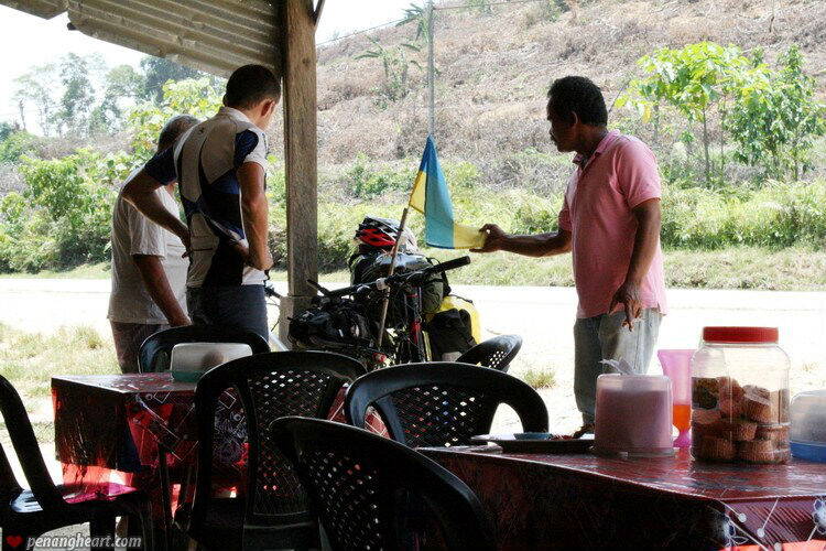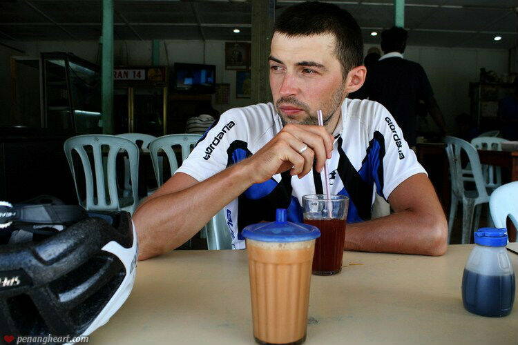 До другої дня ми проїхали заледве тридцять кілометрів і думали, що мукам нашим не буде кінця, коли врешті випхалися на перевал. Попили чайку і гайда вниз. Фактично то вже був початок району Камерон Хайлендс. Після кількагодинного підйому спуск здавався раєм і ми навіть не помітили, як опинилися в першому селі високогір’я. На першій же автобусній зупинці попиталися коли буде автобус на Пенанг. І о диво – він буде за годину. Якраз достатньо часу щоб перекусити і спакуватися. Йдемо до першої забігайлівки, їмо, пробуємо хризантемовий чай і коли автобус прибуває на зупинку, ми вже в повній бойовій готовності їхати.