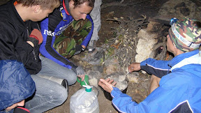 Скупились, заправились, начинаю искать место для спуска, с прошлого года остались только обрывки воспоминаний, помню, что спуск крутой и опасный, но никак не получается его найти. Мой Р7 с трудом досвечивает до терасы, на которую нам нужно спуститься. Но время потраченые на поиски таки потарчено не зря и спуск найден. На фото невозможно передать тех ощущений, что испытывал тогда я. Благо, что остальные участники никогда атм не были и не знают куда спускаются из-за окружающего мрака.