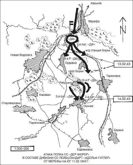 15 февраля командующий 3-й танковой армией П.С. Рыбалко бросил в помощь корпусу 184-ю стрелковую дивизию. Получив помощь, гвардейцы-кавалеристы сразу же провели несколько атак на север, но все они были отражены немцами[187]. Корпус был развернут частью сил в Береке, а частью — восточнее ее. Поскольку сплошная линия фронта отсутствовала, то определить точное место его дислокации возможным не представляется. В завершение отметим, что уж на что, на что, но на победные реляции советские командиры не скупились. По советским данным, за бои 11–15 февраля 6-м гвардейским кавалерийским корпусом было уничтожено 70 немецких танков, причем общее количество атаковавших их танков было расценено ни много ни мало в 200 штук![188] Однако в любом случае эсэсовцы понесли тяжелые потери, особенно полк СС «Дер Фюрер» и танковый батальон Макса Вюнше. Немцы «в долгу не остались», заявив о полном уничтожении 6-го гвардейского кавалерийского корпуса, что, как мы увидели, действительности не соответствовало[189]. С этим корпусом солдаты дивизии СС «Дас Райх» столкнутся и в марте, во время контрнаступления.