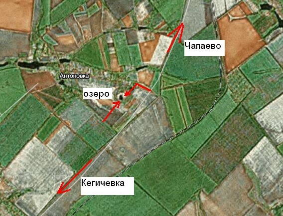 На трассе есть указатель "Антоновка". Она немного в стороне от трассы. Поворачиваем к ней и напротив самого первого дома поворачиваем налево по грунтовой дороге в поле. Дорога одна, перепутать сложно. Едем метров 150 и попадаем на озеро.