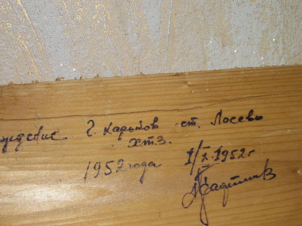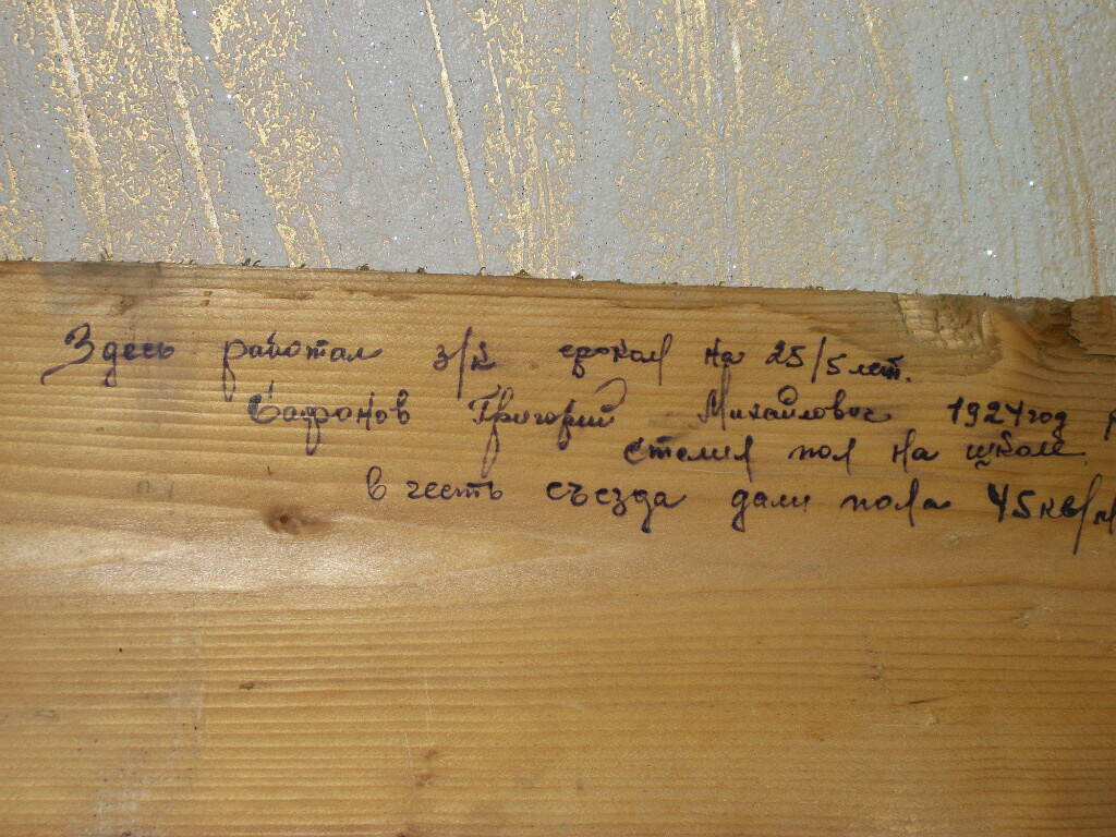 Надписи 61 год. Обнаружили в феврале 2013 при ремонте - идет реконструкция старой школы и будет осуществляться перевод детского сада. Найдена доска в старом здании школы в кабинете физике при строительстве. Может найдутся родственники или знакомые этого человека.
