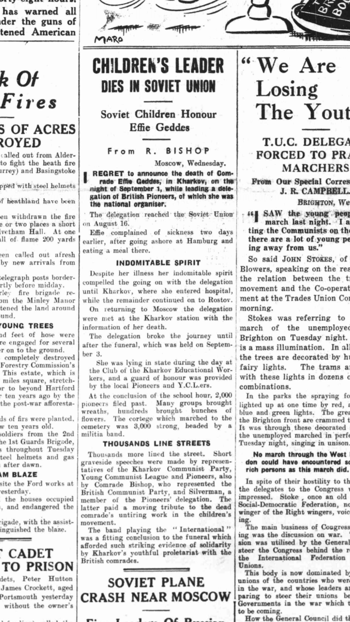 "To the Brother Member of the Communist Party and Communist Union of youth of England EFFY JOHNS was born on 25 Febr.1910y. died on the 2nd September 1933 year"